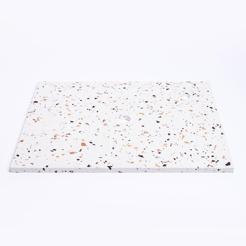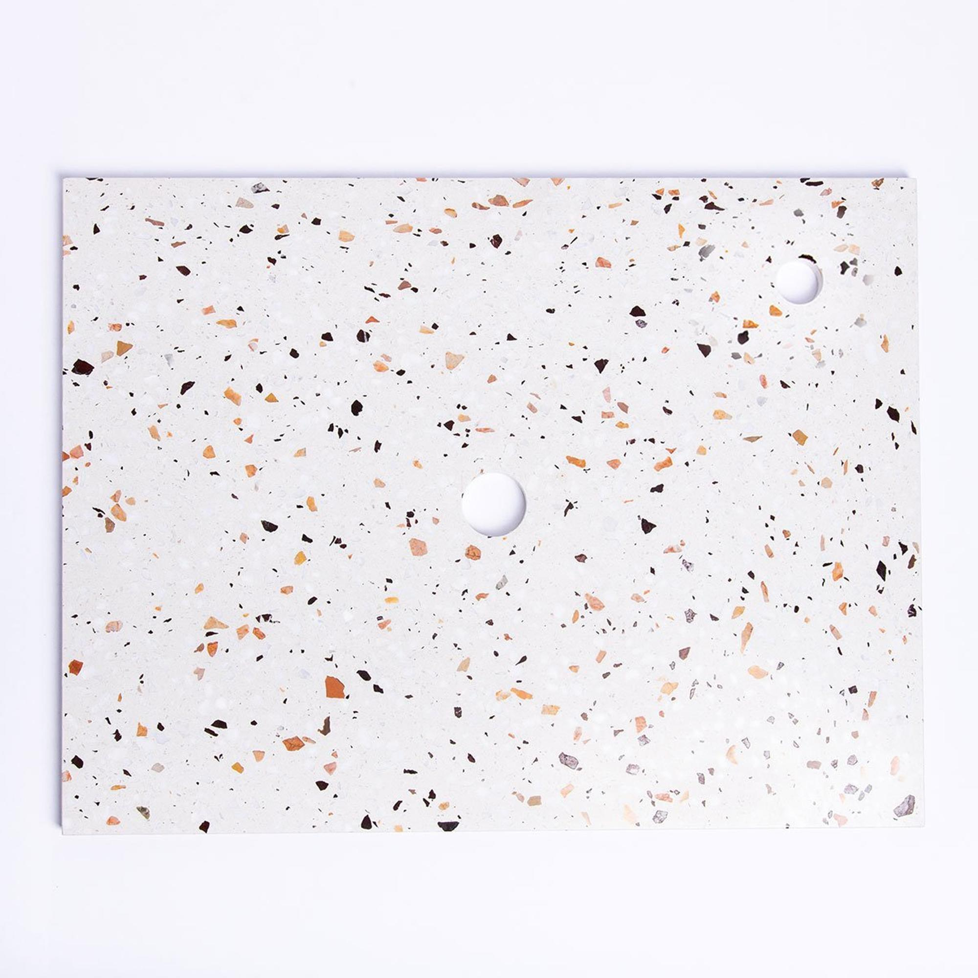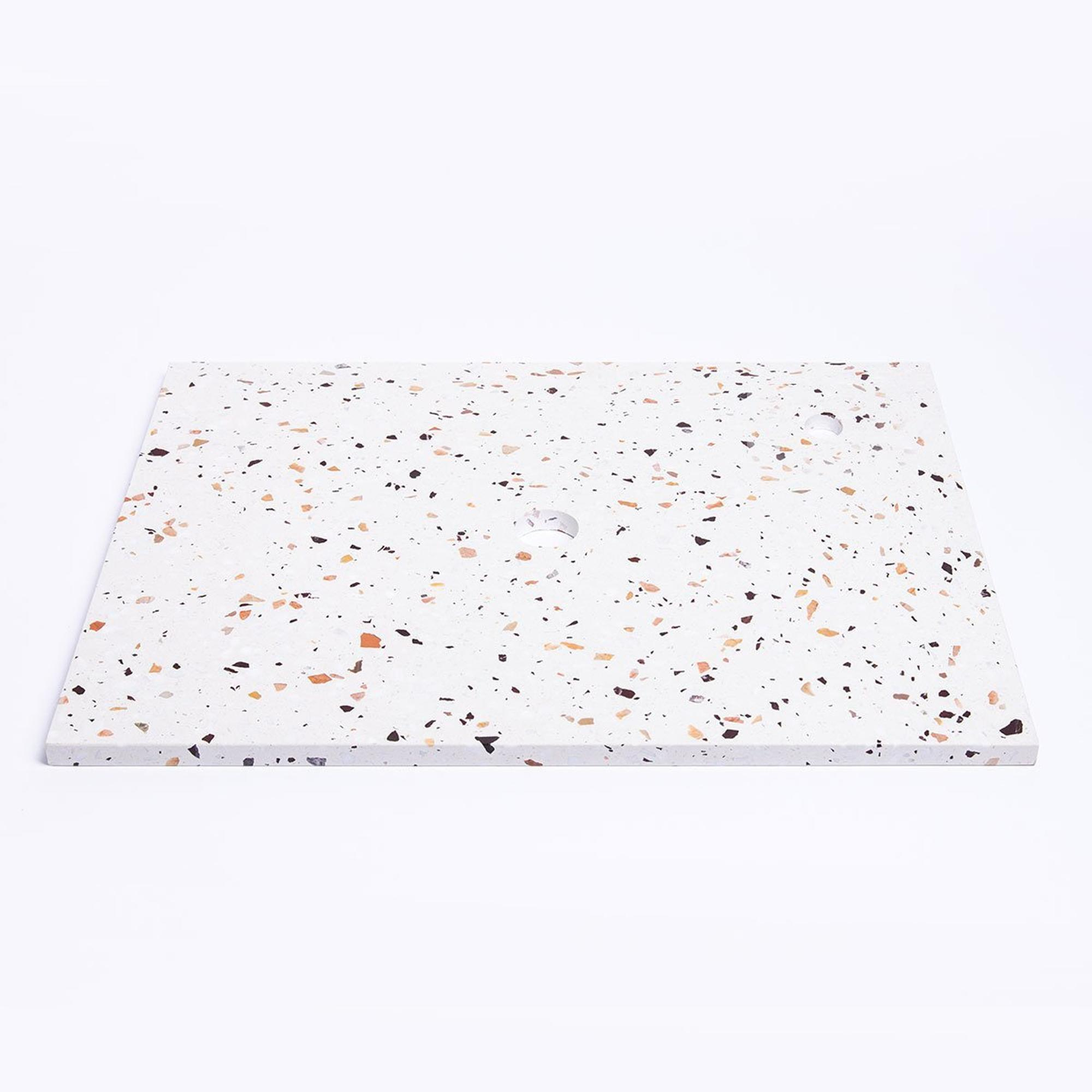 TerrazzoHet topblad heeft een terrazzo-look in een zachte, beige tint. Ondanks de neutrale kleurtint geeft het de badkamer meer dynamiek. Modern met een klassieke touch! Doordat een terrazzo-tegel is opgebouwd uit verschillende kleuren en tinten is deze ideaal om als basis te gebruiken in de badkamer. Om tot een mooi geheel te komen laat je de kleuren uit de terrazzotegel terugkomen in tegels, de kranen of het meubel.