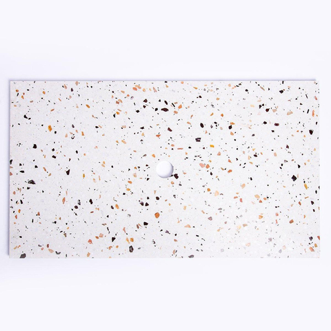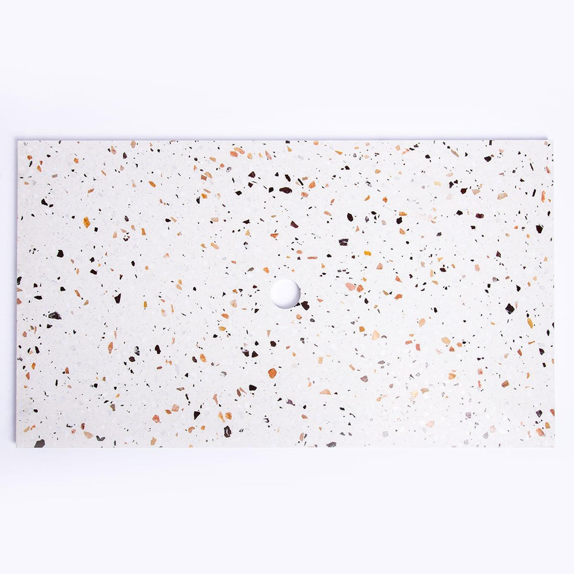 TerrazzoHet topblad heeft een terrazzo-look in een zachte, beige tint. Ondanks de neutrale kleurtint geeft het de badkamer meer dynamiek. Modern met een klassieke touch! Doordat een terrazzo-tegel is opgebouwd uit verschillende kleuren en tinten is deze ideaal om als basis te gebruiken in de badkamer. Om tot een mooi geheel te komen laat je de kleuren uit de terrazzotegel terugkomen in tegels, de kranen of het meubel.