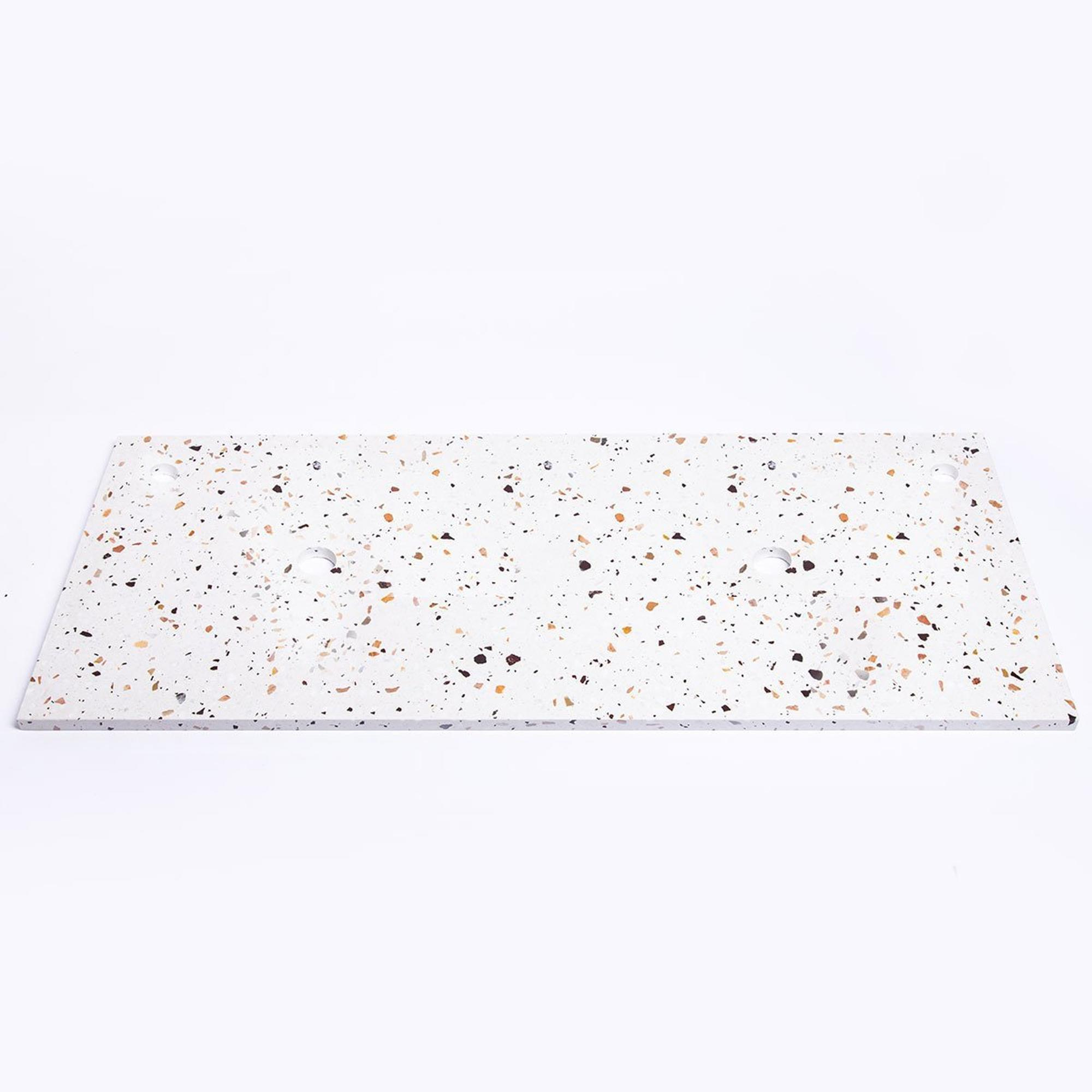 TerrazzoHet topblad heeft een terrazzo-look in een zachte, beige tint. Ondanks de neutrale kleurtint geeft het de badkamer meer dynamiek. Modern met een klassieke touch! Doordat een terrazzo-tegel is opgebouwd uit verschillende kleuren en tinten is deze ideaal om als basis te gebruiken in de badkamer. Om tot een mooi geheel te komen laat je de kleuren uit de terrazzotegel terugkomen in tegels, de kranen of het meubel.