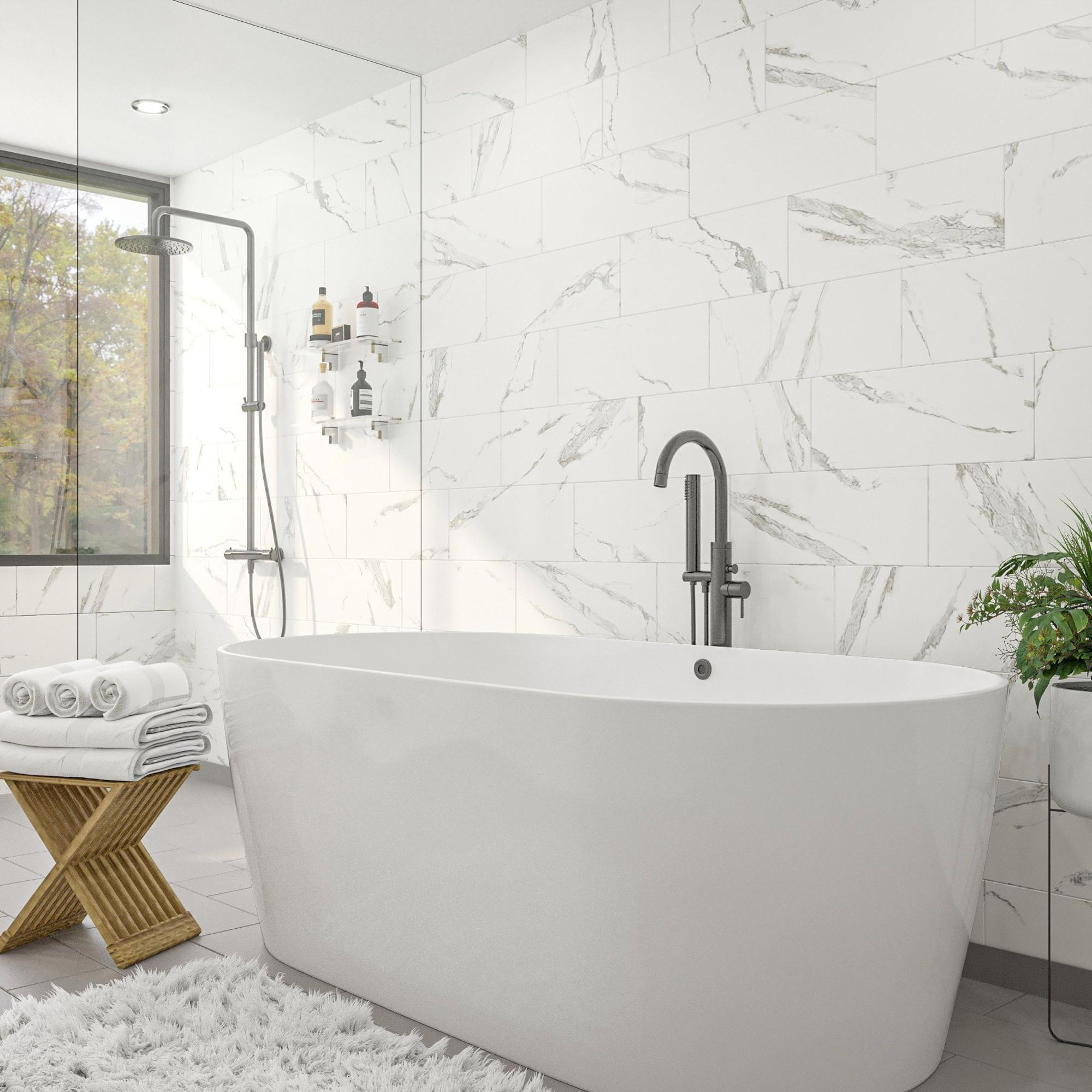 De elegante en vrijstaande badkraan van Adema geeft een luxe uitstraling en maakt de badkamer helemaal af. Door de ronde zwanenhals is de kraan een opvallende verschijning. Combineer de badkraan met een vrijstaand ligbad en creëer een ruimtelijke uitstraling in jouw badkamer. Maak een statement met deze stijlvolle vrijstaande badkraan van Adema.