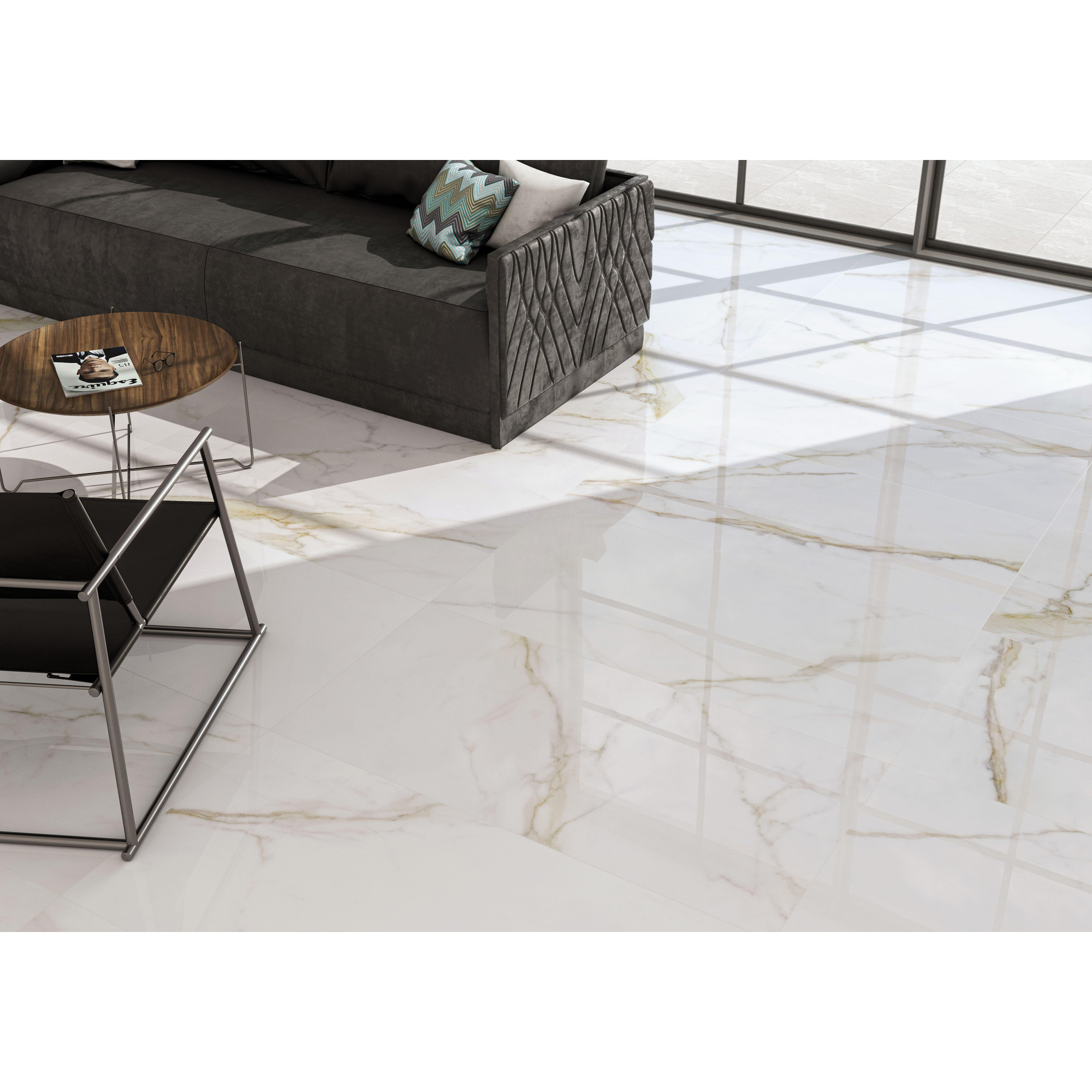 Deze tegel straalt een majestueuze uitstraling uit dankzij de gerectificeerde afwerking en de gouden gepolijste details. Het marmerlook ontwerp geeft een gevoel van luxe en verfijning, waardoor elke ruimte een koninklijk tintje krijgt. De gladde textuur en heldere kleuren van de tegel zorgen voor een tijdloze elegantie die de tand des tijds zal doorstaan.