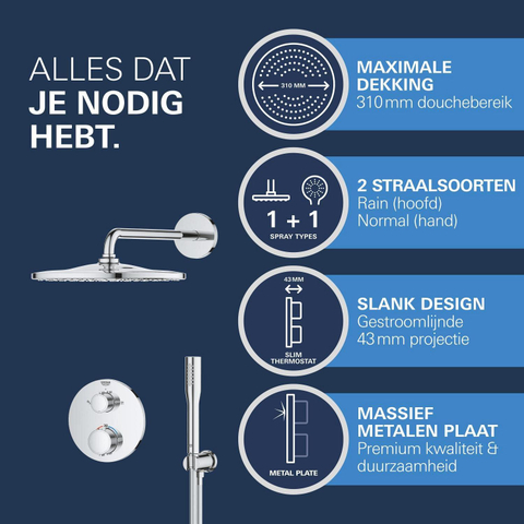 Comfort ontmoet luxe! Het GROHE Precision SmartControl inbouw douchesysteem is de gemakkelijke manier om stijlvol en prestatiegericht te douchen – alles wat je nodig hebt zit in één pakket! De slanke en stijlvolle Precision thermostaatkraan, in combinatie met de Rapido SmartBox universele inbouwbox voor verborgen installatie, levert precisieprestaties. De GROHE TurboStat cartouche zorgt voor een constante toevoer van water op de perfecte temperatuur, terwijl de GROHE Water Saving functie het water- en energieverbruik vermindert zonder in te leveren op de prestaties. Hij is ook gezinsvriendelijk, want de GROHE SafeStop knop is ingesteld op 38°C. Hierdoor behoort verbranden tot het verleden. Met de optionele GROHE SafeStop Plus temperatuurbegrenzer kun je een extra limiet van 43°C toevoegen voor extra veiligheid. Het debiet regel je eenvoudig met de eenvoudige GROHE AquaDimmer, waarmee je het water daarheen kunt leiden waar je wilt en tegelijkertijd het volume kunt instellen. De hoofddouche met een royale afmeting van 310 mm en een arm van 422 mm is voorzien van onze zachte en ontspannende GROHE PureRain Spray. De Stick handdouche beschikt over onze veelzijdige klassieke douchestraal. Hij wordt geleverd met een houder met wandafvoerbocht en een doucheslang van 1500 mm met TwistStop functie. De GROHE DreamSpray technologie zorgt voor een gelijkmatige straal uit elk SpeedClean siliconen sproeigaatje, die je schoonmaakt met een simpele veeg van je vinger. De duurzame GROHE Long-Life afwerking is gemakkelijk schoon te maken en zorgt ervoor dat de set er een leven lang prachtig blijft uitzien. En het goede nieuws is dat de installatie snel en eenvoudig is dankzij GROHE FastFixation, dat beschikt over een vergrendelingssysteem, afgedekt rozet en asafdichting. Dat betekent dat de installatie 100% risicovrij is en dat er geen kans is op lekkages! Het GROHE Precision inbouw douchesysteem – elegantie, veiligheid en prestaties waarop je kunt vertrouwen! bestaat uit: