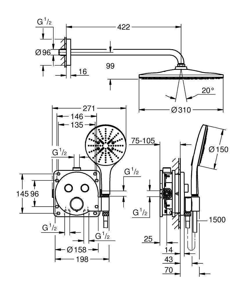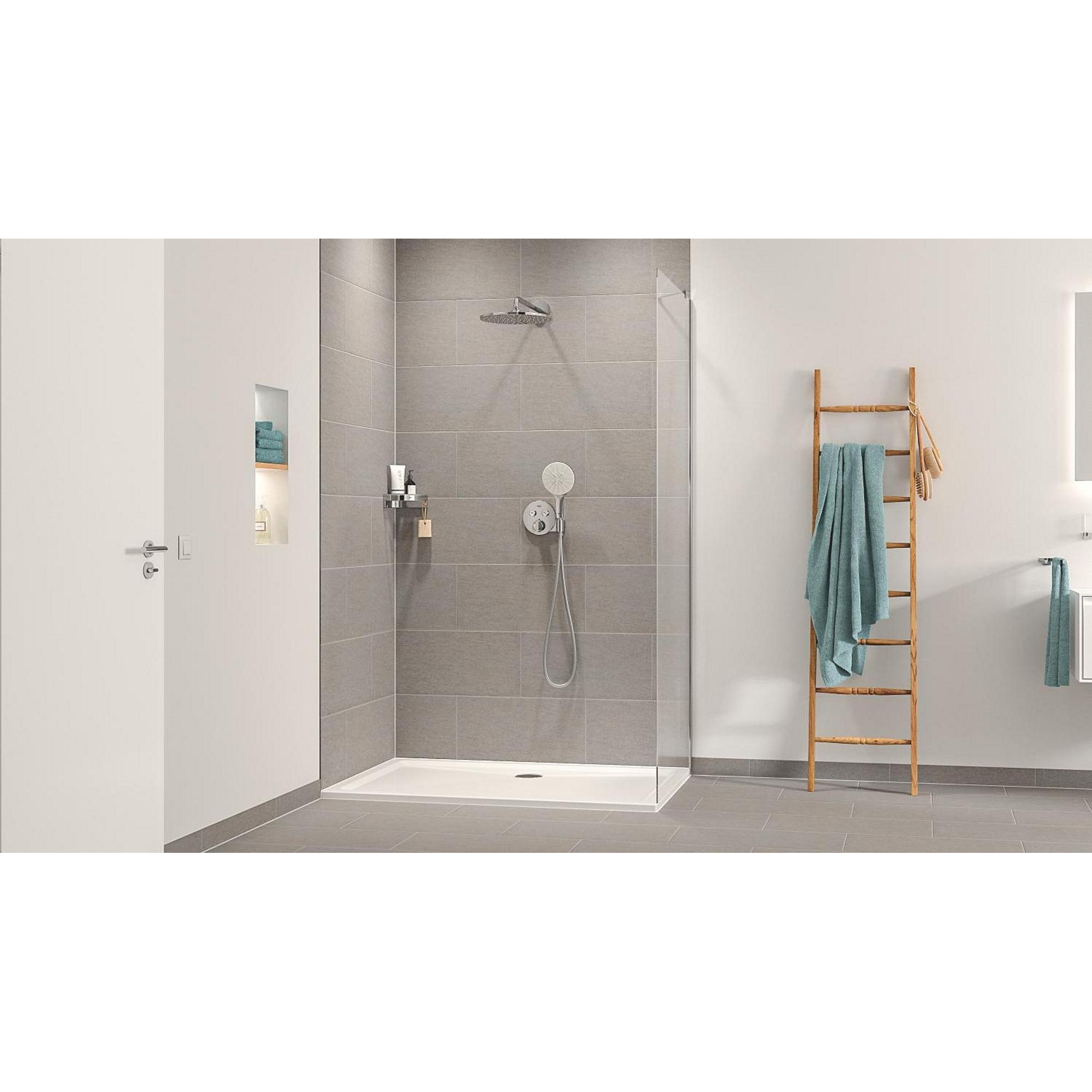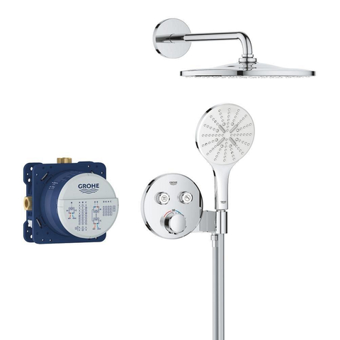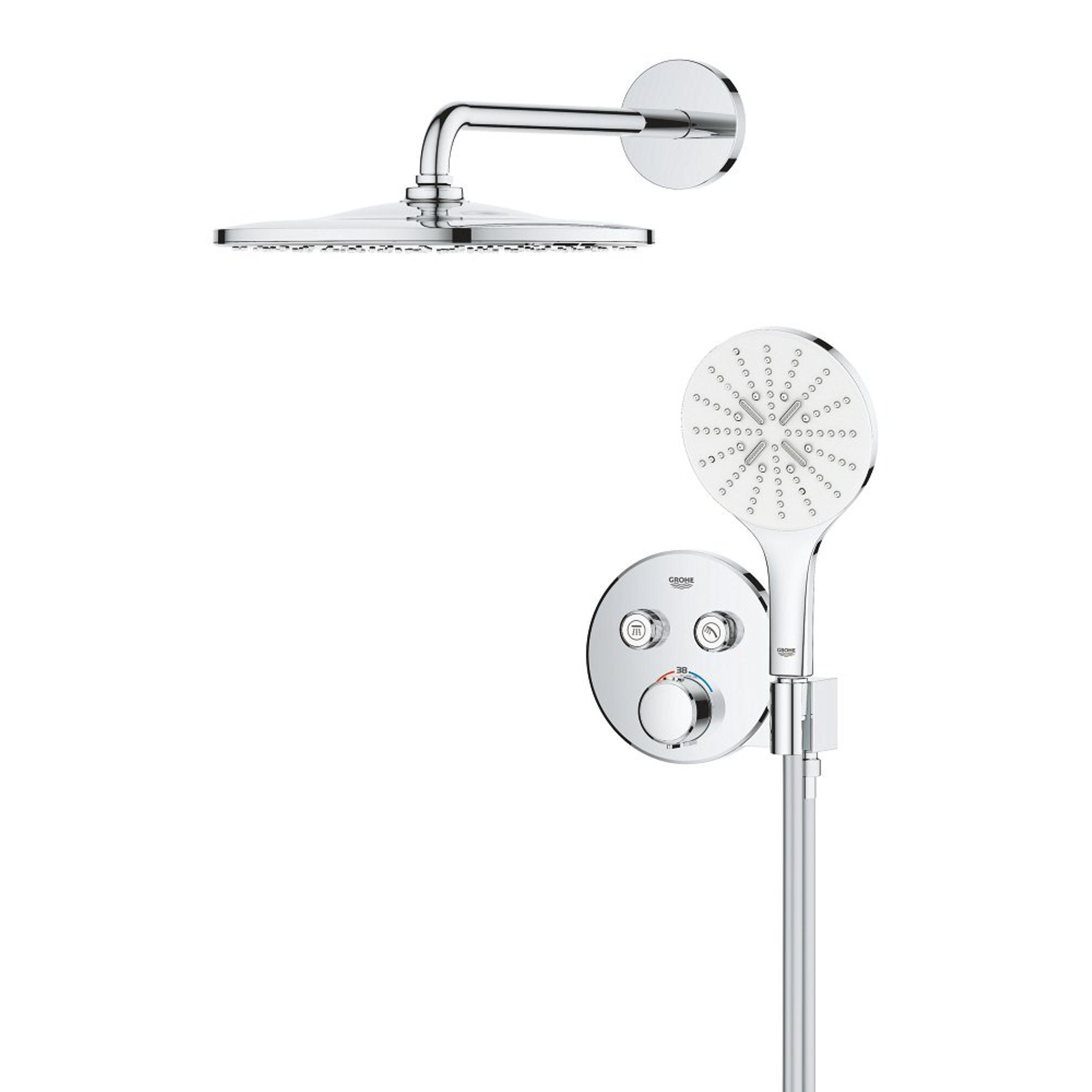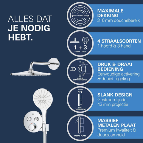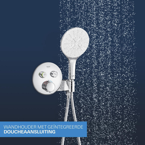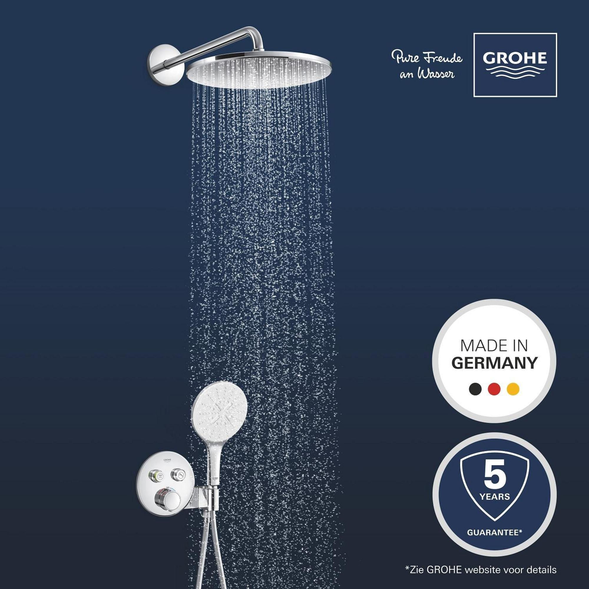 Moderne stijl en topprestaties! Dat is het GROHE Precision SmartControl inbouw douchesysteem, dat alles wat je nodig hebt voor de perfecte douche-ervaring samenbrengt in één pakket. De elegante en superslanke Precision SmartControl thermostaatkraan met geïntegreerde handdouchehouder – in combinatie met de Rapido SmartBox universele inbouwbox voor verborgen installatie – heeft een stoere eigentijdse look, terwijl de Duitse techniek superieure functionaliteit biedt. GROHE TurboStat technologie zorgt voor een constante toevoer van water op de perfecte temperatuur, terwijl de GROHE Water Saving technologie het water- en energieverbruik vermindert zonder in te leveren op de prestaties. Met de innovatieve GROHE SmartControl technologie bedien je je douche heel eenvoudig – selecteer simpelweg de gewenste straal en pas het watervolume aan met één druk op de knop, van waterbesparend tot volledige doorstroming. Dankzij de twee aansluitingen kun je moeiteloos schakelen tussen de hoofd- en handdouche of deze combineren. Hij is ook gezinsvriendelijk, want de GROHE SafeStop knop is ingesteld op 38°C. Hierdoor behoort verbranden tot het verleden. Met de optionele GROHE SafeStop Plus temperatuurbegrenzer kun je een extra limiet van 43°C toevoegen voor extra veiligheid. De hoofddouche met een royale afmeting van 310 mm en een arm van 422 mm is voorzien van onze zachte en ontspannende GROHE PureRain Spray. De handdouche van 130 mm met een TwistStop slang van 1500 mm bevat drie geweldige straalsoorten: de pulserende GROHE ActiveMassage Spray biedt een verkwikkende massage, de Jet Spray zorgt voor een krachtige reiniging en de Rain Spray is net zo zacht als een zomerse regenbui. En wisselen tussen de verschillende straalsoorten is super gemakkelijk met de ergonomische GROHE SmartTip bediening. De GROHE DreamSpray technologie zorgt voor een gelijkmatige straal uit elk SpeedClean siliconen sproeigaatje, die je schoonmaakt met een simpele veeg van je vinger. De duurzame GROHE Long-Life afwerking is eenvoudig te reinigen en zorgt ervoor dat de set er een leven lang onberispelijk blijft uitzien. En het goede nieuws is dat de installatie snel en eenvoudig is, dankzij GROHE FastFixation, dat beschikt over een vergrendelingssysteem, afgedekt rozet en asafdichting. Dat betekent dat er geen risico is op lekken! Het GROHE Precision SmartControl inbouw douchesysteem – het is stijlvol, superslim en staat garant voor douchegenot! bestaat uit: