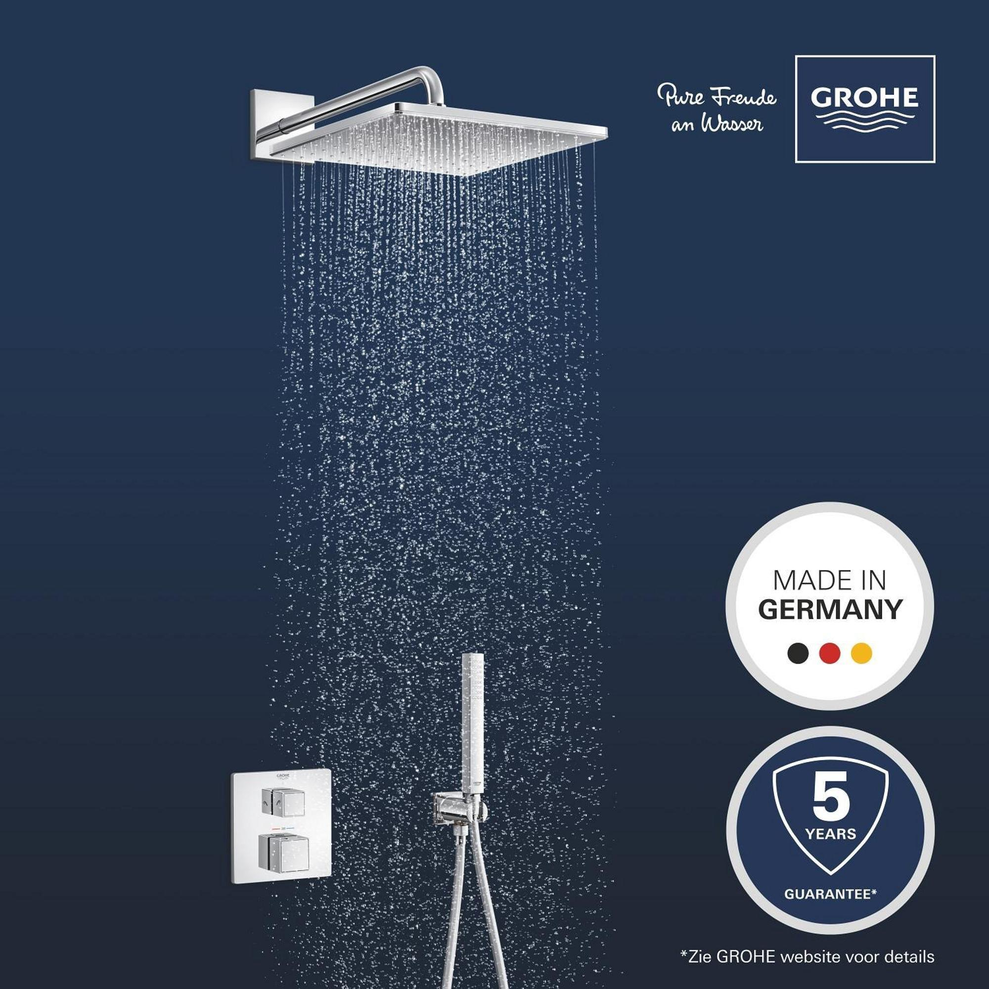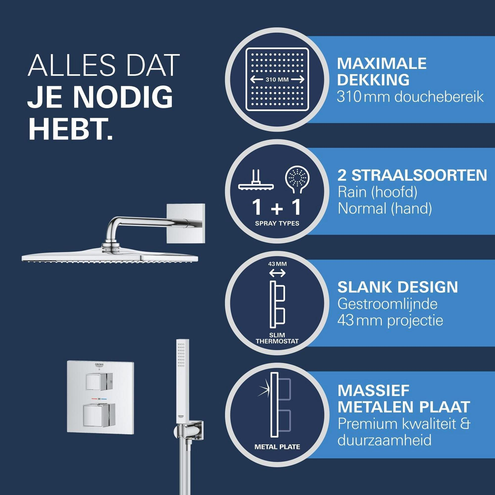 Moderne stijl en superieure functionaliteit! Dat is het GROHE Precision SmartControl inbouw douchesysteem, dat alles wat je nodig hebt voor de perfecte douche-ervaring samenbrengt in één pakket. De elegante en superslanke Grohtherm SmartControl thermostaatkraan met geïntegreerde handdouchehouder – gecombineerd met de Rapido SmartBox universele inbouwbox – beschikt binnenin over Duitse technologie die precisieprestaties levert. GROHE TurboStat technologie zorgt voor een constante toevoer van water op de perfecte temperatuur, terwijl de GROHE Water Saving technologie het water- en energieverbruik vermindert zonder in te leveren op de prestaties. Met de innovatieve GROHE SmartControl bediening kun je je douche heel eenvoudig bedienen – selecteer simpelweg de gewenste straalsoort en stel met één druk op de knop het watervolume in van waterbesparend tot volledige doorstroming. Dankzij de twee aansluitingen kun je moeiteloos schakelen tussen de hoofd- en handdouche of deze combineren. Hij is ook gezinsvriendelijk, want de GROHE SafeStop knop is ingesteld op 38°C. Hierdoor behoort verbranden tot het verleden. Met de optionele GROHE SafeStop Plus temperatuurbegrenzer kun je een extra limiet van 43°C toevoegen voor extra veiligheid. De veelzijdige hoofddouche van 260 mm met een arm van 380 mm heeft 3 verschillende straalsoorten: De Jet Spray is krachtig en gericht, perfect om shampoo uit te wassen. De SmartRain Spray is breder voor een energieke maar ontspannende ervaring. En de rustgevende Rain Spray gebruikt alle sproeigaatjes op de sproeiplaat om het hele lichaam te omhullen. Om de straalsoort te kiezen, draai je gewoon aan de knop in het midden van de douchekop. En de slanke Stick handdouche met een 1500 mm TwistStop slang beschikt over de veelzijdige klassieke douchestraal. De GROHE DreamSpray technologie zorgt voor een gelijkmatige straal uit elk SpeedClean siliconen sproeigaatje, die je schoonmaakt met een simpele veeg van je vinger. De duurzame GROHE Long-Life afwerking is gemakkelijk schoon te maken en zorgt ervoor dat de set er jarenlang mooi blijft uitzien. En het goede nieuws is dat de installatie snel en eenvoudig is dankzij GROHE FastFixation, dat beschikt over een vergrendelingssysteem, afgedekt rozet en asafdichting. Dat betekent dat er geen risico is op lekken! Het GROHE Precision SmartControl inbouw douchesysteem staat voor elegantie en luxe! bestaat uit: