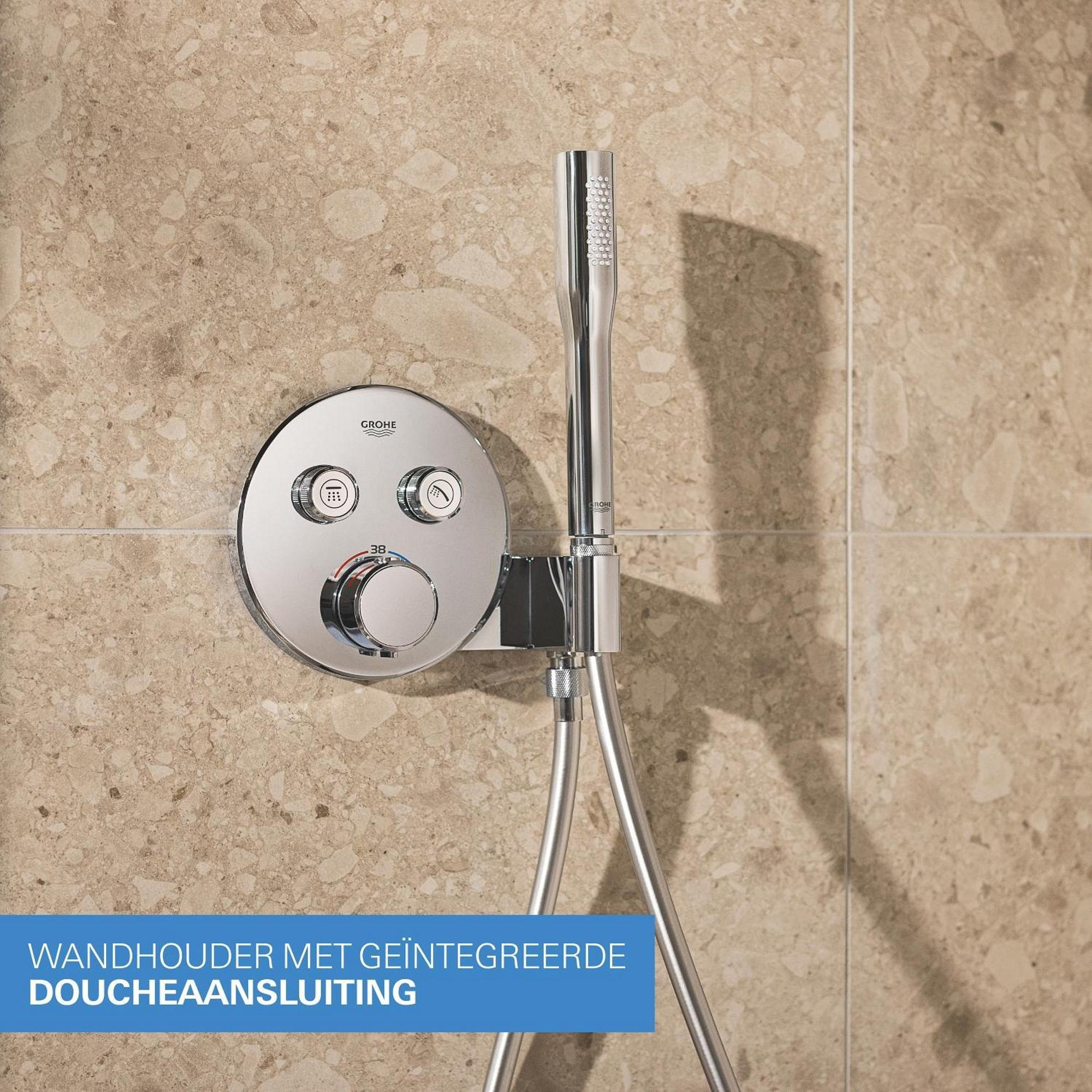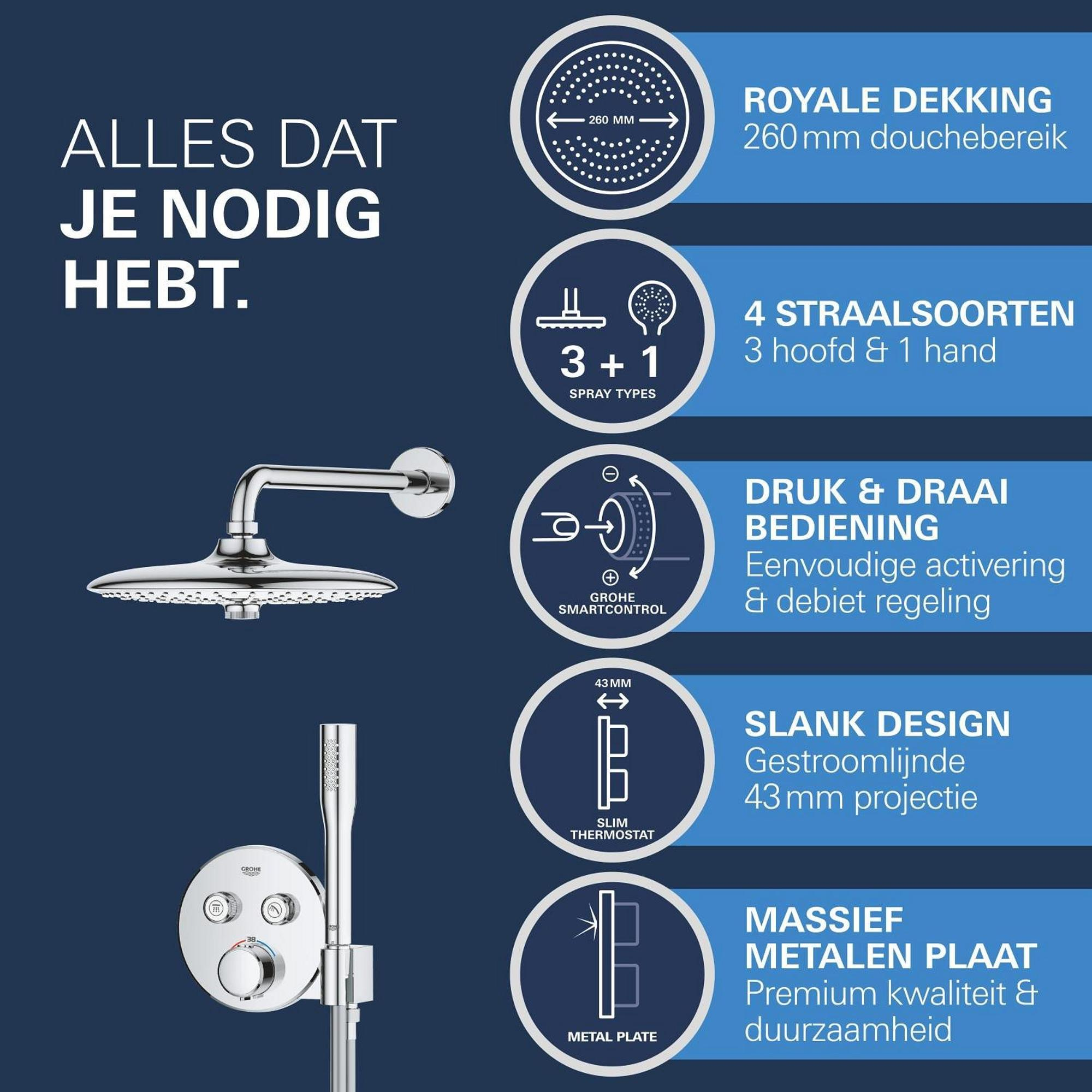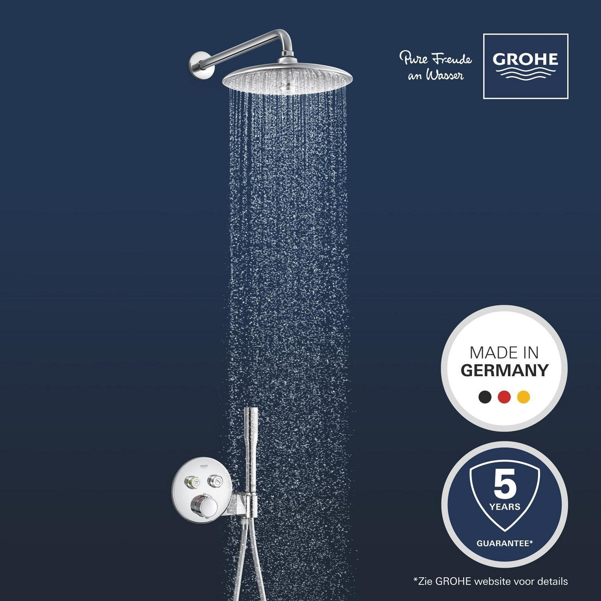 Moderne stijl en superieure functionaliteit! Dat is het GROHE Precision SmartControl inbouw douchesysteem, dat alles wat je nodig hebt voor de perfecte douche-ervaring samenbrengt in één pakket. De elegante en superslanke Grohtherm SmartControl thermostaatkraan met geïntegreerde handdouchehouder – gecombineerd met de Rapido SmartBox universele inbouwbox – beschikt binnenin over Duitse technologie die precisieprestaties levert. GROHE TurboStat technologie zorgt voor een constante toevoer van water op de perfecte temperatuur, terwijl de GROHE Water Saving technologie het water- en energieverbruik vermindert zonder in te leveren op de prestaties. Met de innovatieve GROHE SmartControl bediening kun je je douche heel eenvoudig bedienen – selecteer simpelweg de gewenste straalsoort en stel met één druk op de knop het watervolume in van waterbesparend tot volledige doorstroming. Dankzij de twee aansluitingen kun je moeiteloos schakelen tussen de hoofd- en handdouche of deze combineren. Hij is ook gezinsvriendelijk, want de GROHE SafeStop knop is ingesteld op 38°C. Hierdoor behoort verbranden tot het verleden. Met de optionele GROHE SafeStop Plus temperatuurbegrenzer kun je een extra limiet van 43°C toevoegen voor extra veiligheid. De veelzijdige hoofddouche van 260 mm met een arm van 380 mm heeft 3 verschillende straalsoorten: De Jet Spray is krachtig en gericht, perfect om shampoo uit te wassen. De SmartRain Spray is breder voor een energieke maar ontspannende ervaring. En de rustgevende Rain Spray gebruikt alle sproeigaatjes op de sproeiplaat om het hele lichaam te omhullen. Om de straalsoort te kiezen, draai je gewoon aan de knop in het midden van de douchekop. En de slanke Stick handdouche met een 1500 mm TwistStop slang beschikt over de veelzijdige klassieke douchestraal. De GROHE DreamSpray technologie zorgt voor een gelijkmatige straal uit elk SpeedClean siliconen sproeigaatje, die je schoonmaakt met een simpele veeg van je vinger. De duurzame GROHE Long-Life afwerking is gemakkelijk schoon te maken en zorgt ervoor dat de set er jarenlang mooi blijft uitzien. En het goede nieuws is dat de installatie snel en eenvoudig is dankzij GROHE FastFixation, dat beschikt over een vergrendelingssysteem, afgedekt rozet en asafdichting. Dat betekent dat er geen risico is op lekken! Het GROHE Precision SmartControl inbouw douchesysteem staat voor elegantie en luxe! bestaat uit: