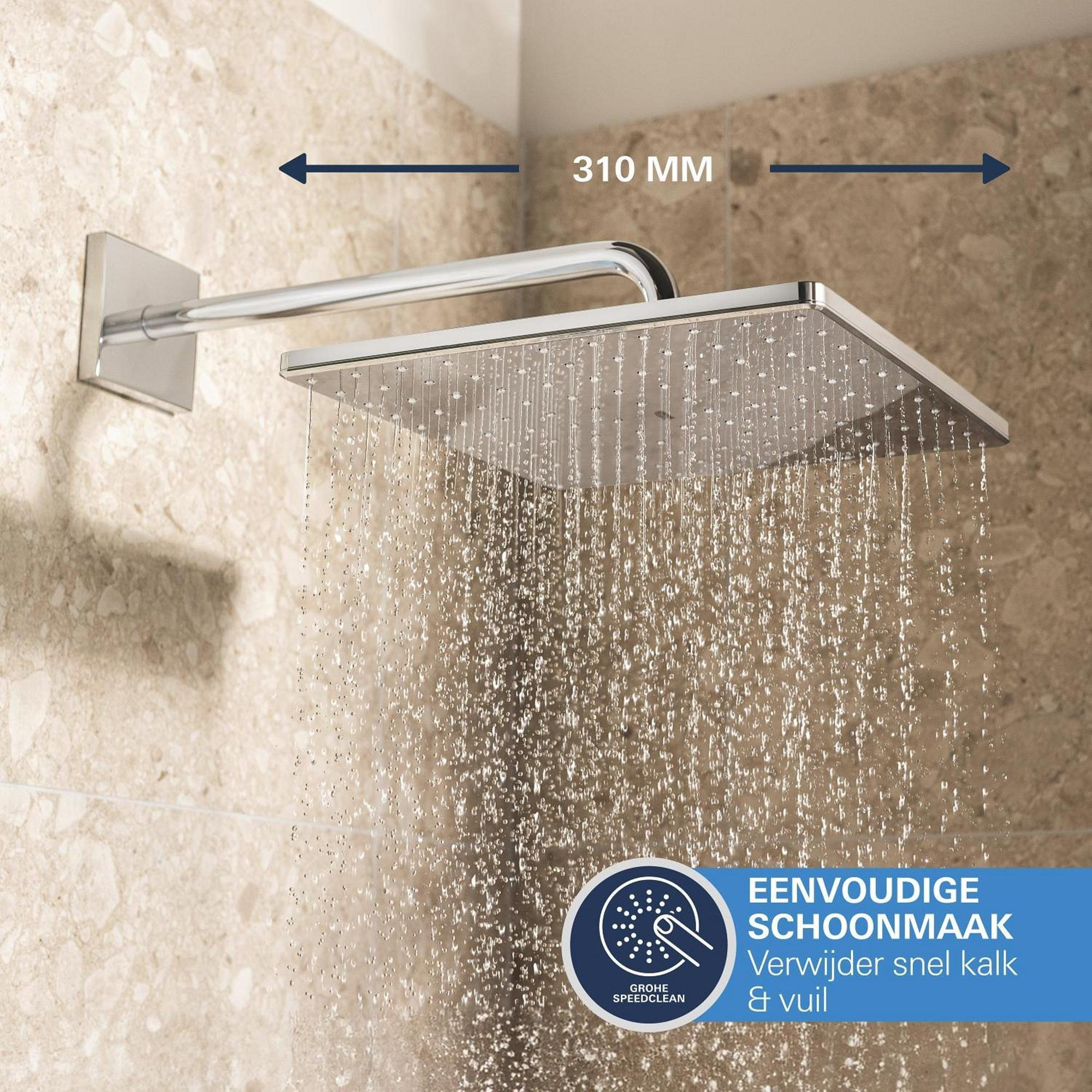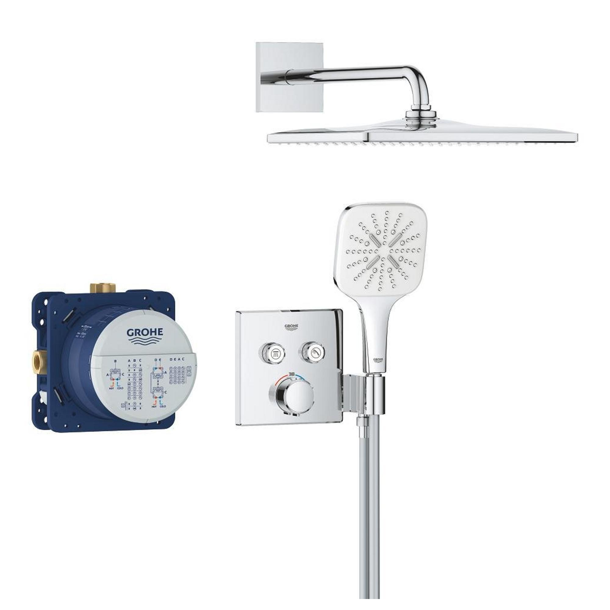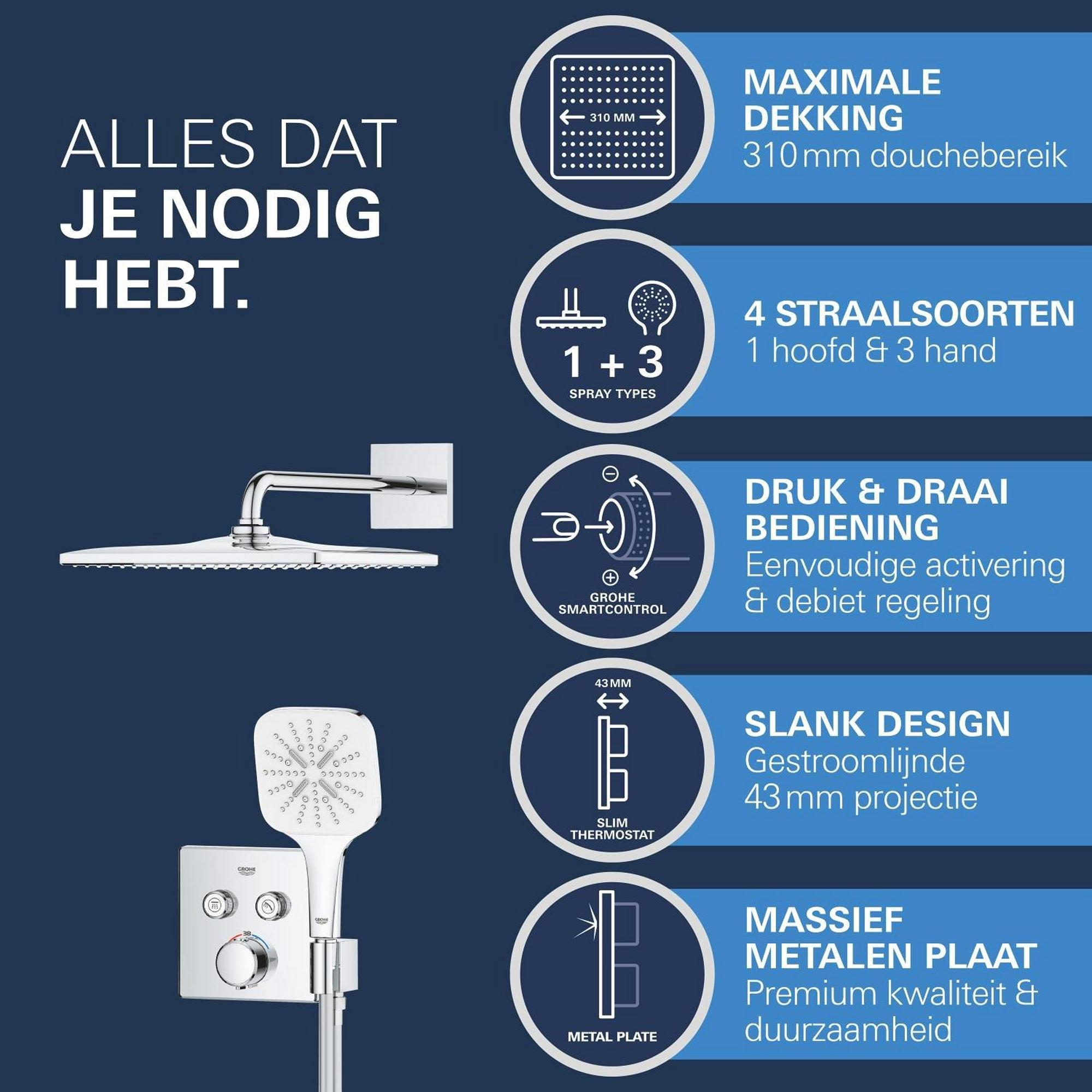 Het indrukwekkende GROHE Precision SmartControl inbouw douchesysteem heeft alles wat je nodig hebt voor de perfecte douche-ervaring in één pakket en voegt direct stijl en luxe toe! De elegante en superslanke Precision SmartControl thermostaatkraan met geïntegreerde handdouchehouder – gecombineerd met de Rapido SmartBox universele inbouwbox – heeft een stoere kubusvormige look en levert nauwkeurige prestaties dankzij de Duitse techniek. GROHE TurboStat technologie zorgt voor een constante toevoer van water op de perfecte temperatuur, terwijl de GROHE Water Saving technologie het water- en energieverbruik vermindert zonder in te leveren op de prestaties. Met de innovatieve GROHE SmartControl technologie kun je je douche heel eenvoudig bedienen – selecteer gewoon de gewenste straal en pas het watervolume aan met één druk op de knop, van waterbesparend tot volledige doorstroming. Dankzij de twee aansluitingen kun je moeiteloos schakelen tussen de hoofd- en handdouche of deze combineren. Hij is ook gezinsvriendelijk, want de GROHE SafeStop knop is ingesteld op 38°C. Hierdoor behoort verbranden tot het verleden. Met de optionele GROHE SafeStop Plus temperatuurbegrenzer kun je een extra limiet van 43°C toevoegen voor extra veiligheid. De royale hoofddouche van 310 mm met een arm van 422 mm is voorzien van onze zachte en ontspannende GROHE PureRain Spray. De handdouche van 130 mm met een TwistStop slang van 1500 mm bevat drie geweldige straalsoorten: de pulserende GROHE ActiveMassage Spray biedt een verkwikkende massage, de Jet Spray zorgt voor een krachtige reiniging en de Rain Spray is net zo zacht als een zomerse regenbui. En wisselen tussen de verschillende straalsoorten is super gemakkelijk met de ergonomische GROHE SmartTip bediening. De GROHE DreamSpray technologie zorgt voor een gelijkmatige straal uit elk SpeedClean siliconen sproeigaatje, die je schoonmaakt met een simpele veeg van je vinger. De duurzame GROHE Long-Life afwerking is eenvoudig te reinigen en zorgt ervoor dat de set er een leven lang onberispelijk blijft uitzien. En het goede nieuws is dat de installatie snel en eenvoudig is dankzij GROHE FastFixation, dat beschikt over een vergrendelingssysteem, afgedekt rozet en asafdichting. Dat betekent dat er geen risico is op lekken! Het GROHE Precision SmartControl inbouw douchesysteem – eenvoud, stijl en superieure functionaliteit! bestaat uit: