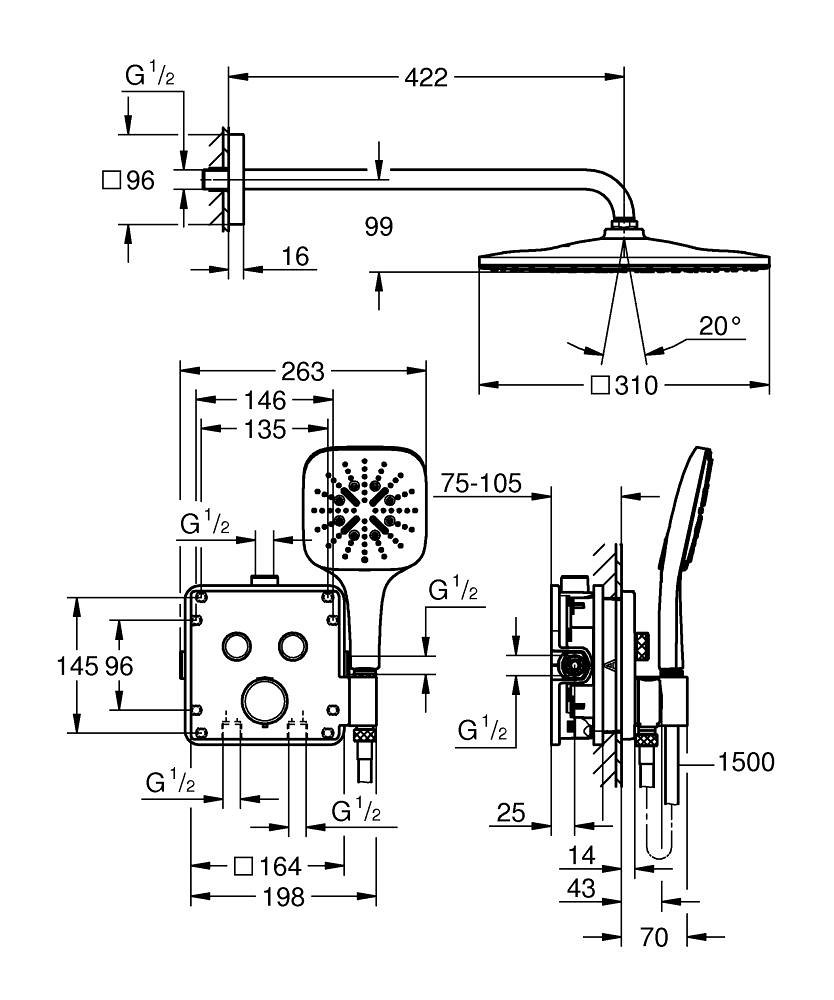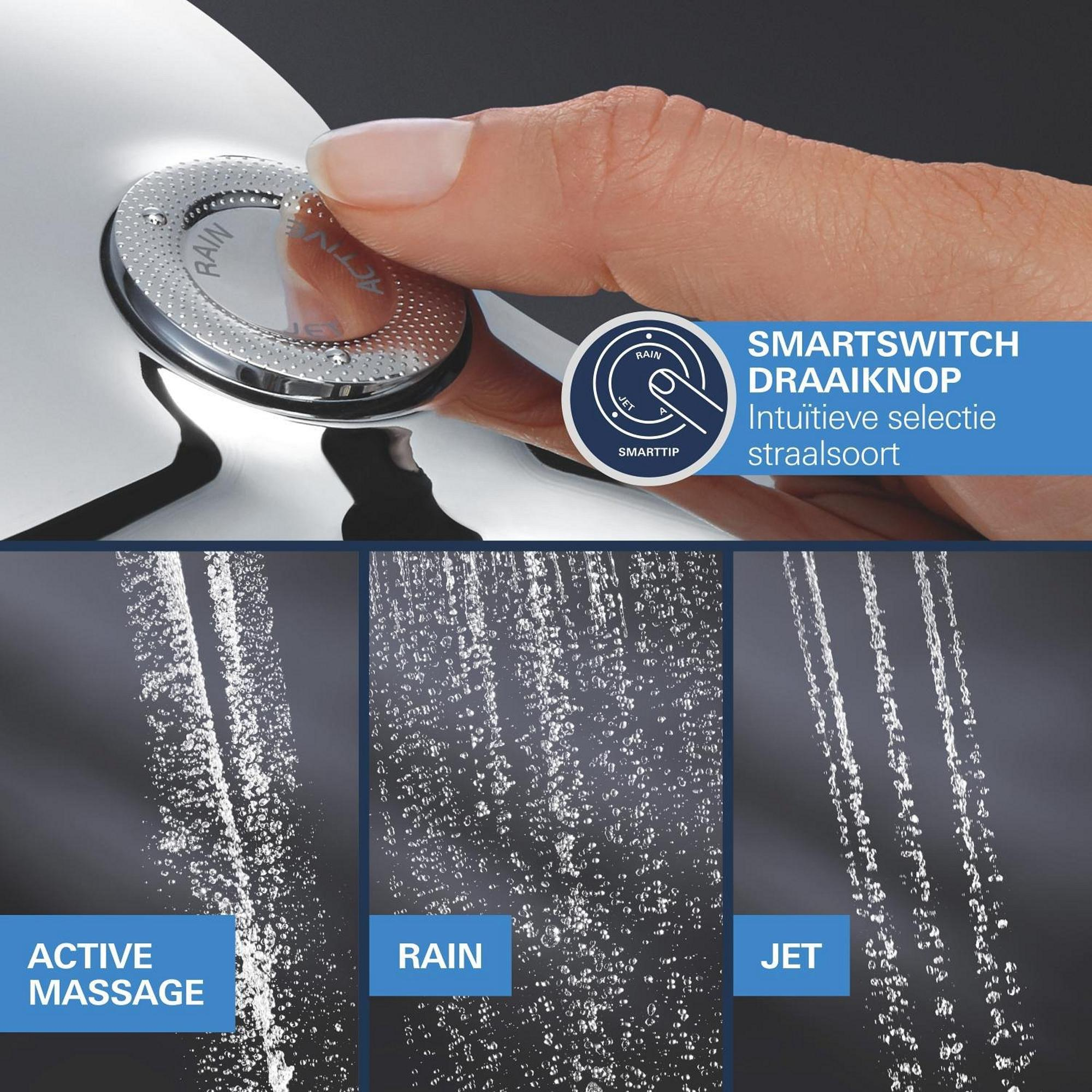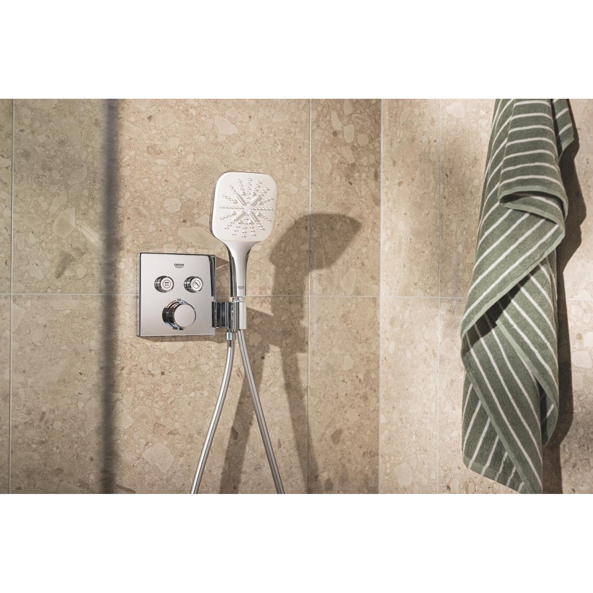 Het indrukwekkende GROHE Precision SmartControl inbouw douchesysteem heeft alles wat je nodig hebt voor de perfecte douche-ervaring in één pakket en voegt direct stijl en luxe toe! De elegante en superslanke Precision SmartControl thermostaatkraan met geïntegreerde handdouchehouder – gecombineerd met de Rapido SmartBox universele inbouwbox – heeft een stoere kubusvormige look en levert nauwkeurige prestaties dankzij de Duitse techniek. GROHE TurboStat technologie zorgt voor een constante toevoer van water op de perfecte temperatuur, terwijl de GROHE Water Saving technologie het water- en energieverbruik vermindert zonder in te leveren op de prestaties. Met de innovatieve GROHE SmartControl technologie kun je je douche heel eenvoudig bedienen – selecteer gewoon de gewenste straal en pas het watervolume aan met één druk op de knop, van waterbesparend tot volledige doorstroming. Dankzij de twee aansluitingen kun je moeiteloos schakelen tussen de hoofd- en handdouche of deze combineren. Hij is ook gezinsvriendelijk, want de GROHE SafeStop knop is ingesteld op 38°C. Hierdoor behoort verbranden tot het verleden. Met de optionele GROHE SafeStop Plus temperatuurbegrenzer kun je een extra limiet van 43°C toevoegen voor extra veiligheid. De royale hoofddouche van 310 mm met een arm van 422 mm is voorzien van onze zachte en ontspannende GROHE PureRain Spray. De handdouche van 130 mm met een TwistStop slang van 1500 mm bevat drie geweldige straalsoorten: de pulserende GROHE ActiveMassage Spray biedt een verkwikkende massage, de Jet Spray zorgt voor een krachtige reiniging en de Rain Spray is net zo zacht als een zomerse regenbui. En wisselen tussen de verschillende straalsoorten is super gemakkelijk met de ergonomische GROHE SmartTip bediening. De GROHE DreamSpray technologie zorgt voor een gelijkmatige straal uit elk SpeedClean siliconen sproeigaatje, die je schoonmaakt met een simpele veeg van je vinger. De duurzame GROHE Long-Life afwerking is eenvoudig te reinigen en zorgt ervoor dat de set er een leven lang onberispelijk blijft uitzien. En het goede nieuws is dat de installatie snel en eenvoudig is dankzij GROHE FastFixation, dat beschikt over een vergrendelingssysteem, afgedekt rozet en asafdichting. Dat betekent dat er geen risico is op lekken! Het GROHE Precision SmartControl inbouw douchesysteem – eenvoud, stijl en superieure functionaliteit! bestaat uit: