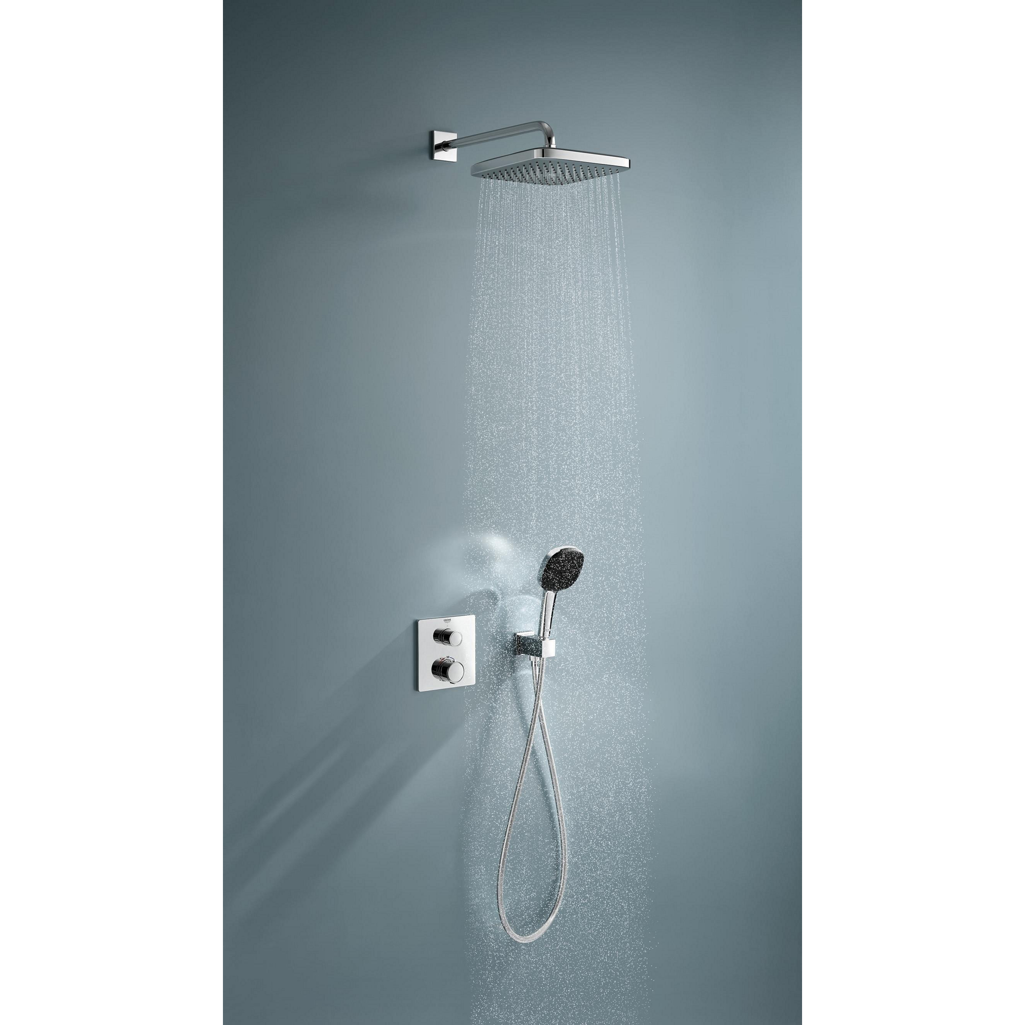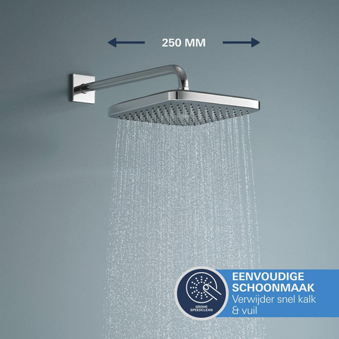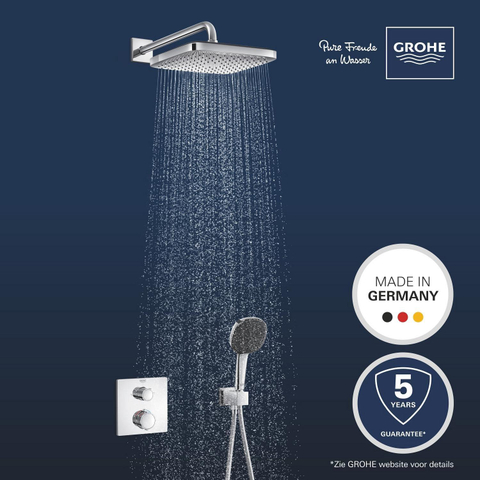 Luxueus douchen met stijl en prestaties gecombineerd in één handig pakket – dat is het GROHE Precision inbouw douchesysteem! De Precision thermostaatkraan, in combinatie met de Rapido SmartBox universele inbouwbox voor verborgen installatie, levert precisieprestaties. GROHE TurboStat technologie zorgt voor een constante toevoer van water op de perfecte temperatuur, terwijl de GROHE Water Saving technologie het water- en energieverbruik vermindert zonder in te leveren op de prestaties. Hij is ook gezinsvriendelijk, want de GROHE SafeStop knop is ingesteld op 38°C. Hierdoor behoort verbranden tot het verleden. Met de optionele GROHE SafeStop Plus temperatuurbegrenzer kun je een extra limiet van 43°C toevoegen voor extra veiligheid. Het debiet regel je eenvoudig met de eenvoudige GROHE AquaDimmer, waarmee je het water daarheen kunt leiden waar je wilt en tegelijkertijd het volume kunt instellen. De hoofddouche van 250 mm met een arm van 380 mm is voorzien van onze zachte en ontspannende Rain Spray. De handdouche van 110 mm biedt de krachtige, gerichte Jet Spray en de rustgevende Rain Spray via de innovatieve GROHE SmartSwitch draaiknop. Hij wordt geleverd met een houder met wandafvoerbocht en een doucheslang van 1500 mm met TwistStop ontwerp. De GROHE DreamSpray technologie zorgt voor een gelijkmatige straal uit elk SpeedClean siliconen sproeigaatje, die je schoonmaakt met een simpele veeg van je vinger. De duurzame GROHE Long-Life afwerking is gemakkelijk schoon te maken en zorgt ervoor dat de set er een leven lang prachtig blijft uitzien. En het goede nieuws is dat de installatie snel en eenvoudig is dankzij GROHE FastFixation, dat beschikt over een vergrendelingssysteem, afgedekt rozet en asafdichting. Dat betekent dat er geen risico is op lekken! Het briljante GROHE Precision inbouw douchesysteem – de handige oplossing die luxe en prestaties levert waarop je kunt vertrouwen! bestaat uit: