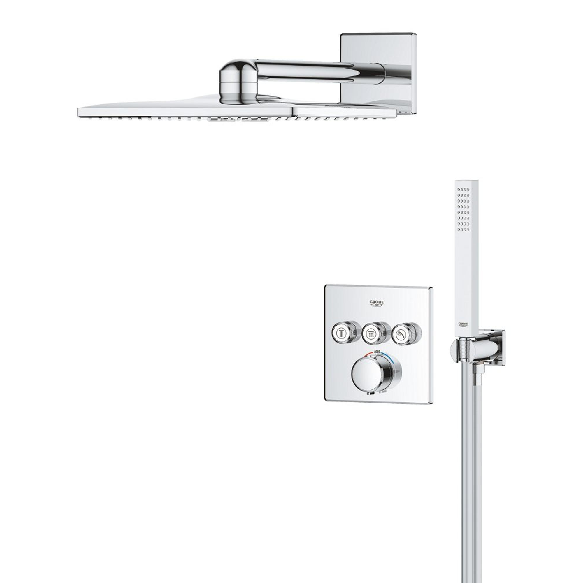 Upgrade je doucheplezier met de GROHE Precision SmartControl inbouw douchesysteem met een stijlvol vierkant design – alles wat je nodig hebt in één pakket! De Precision SmartControl thermostaatkraan in combinatie met de Rapido SmartBox universele inbouwbox voor verborgen installatie – heeft een opvallende look, terwijl de Duitse techniek superieure functionaliteit biedt. GROHE TurboStat technologie zorgt voor een constante toevoer van water op de perfecte temperatuur, terwijl de GROHE Water Saving technologie het water- en energieverbruik vermindert zonder in te leveren op de prestaties. Met de innovatieve GROHE SmartControl technologie bedien je je douche heel eenvoudig – selecteer simpelweg de gewenste straal en pas het watervolume aan met één druk op de knop, van waterbesparend tot volledige doorstroming. De drie aansluitingen bieden totale flexibiliteit – je kunt schakelen tussen verschillende straalsoorten en watertoevoeren of deze zelfs combineren. Hij is ook gezinsvriendelijk, want de GROHE SafeStop knop is ingesteld op 38°C. Hierdoor behoort verbranden tot het verleden. Met de optionele GROHE SafeStop Plus temperatuurbegrenzer kun je een extra limiet van 43°C toevoegen voor extra veiligheid. De hoofddouche met een royale diameter van 310 mm en een arm van 430 mm is voorzien van onze zachte en ontspannende GROHE PureRain Spray en de krachtige ActiveRain Spray, die ideaal is om je haar af te spoelen en je huid te stimuleren. De Stick Cube handdouche is voorzien van onze veelzijdige klassieke douchestraal. Hij wordt geleverd met een houder met wandafvoerbocht en een doucheslang van 1500 mm met TwistStop functie. De GROHE DreamSpray technologie zorgt voor een gelijkmatige straal uit elk SpeedClean siliconen sproeigaatje, die je schoonmaakt met een simpele veeg van je vinger. De duurzame GROHE Long-Life afwerking is gemakkelijk schoon te maken en zorgt ervoor dat de set er nog jaren prachtig uitziet. En het goede nieuws is dat de installatie snel en eenvoudig is dankzij GROHE FastFixation, dat beschikt over een vergrendelingssysteem, afgedekt rozet en asafdichting. Dat betekent dat er geen risico is op lekken! Het GROHE Precision SmartControl inbouw douchesysteem is een super slimme oplossing – alles-in-één luxe en superieure functionaliteit die jaar na jaar presteert! bestaat uit: