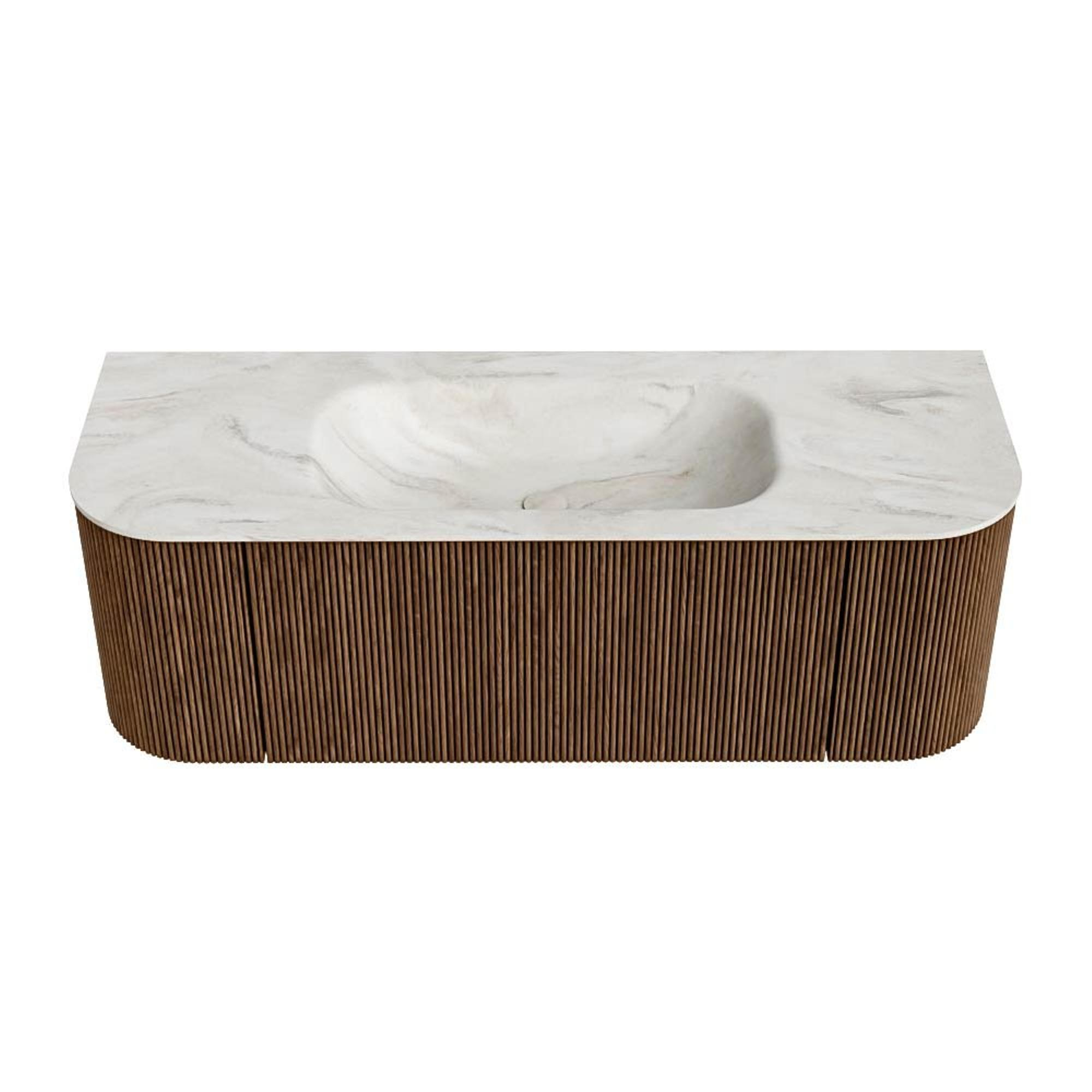 MONDIAZ KURVE-DLUX 130cm badmeubel met module 25 Len R kleur Walnut met 1 lade en 2 deuren. Wastafel BIG SMALL midden 1 kraangat kleur Ostra.