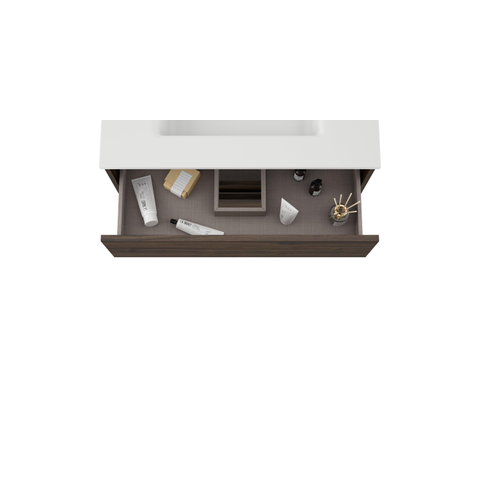 De onderkast is vervaardigd uit MFC-materiaal in een warme notenkleur, wat een natuurlijke en luxe uitstraling aan je badkamer geeft. De combinatie van het eiken houtlook en de witte wastafel zorgt voor een mooie balans tussen moderne en klassieke stijlelementen.