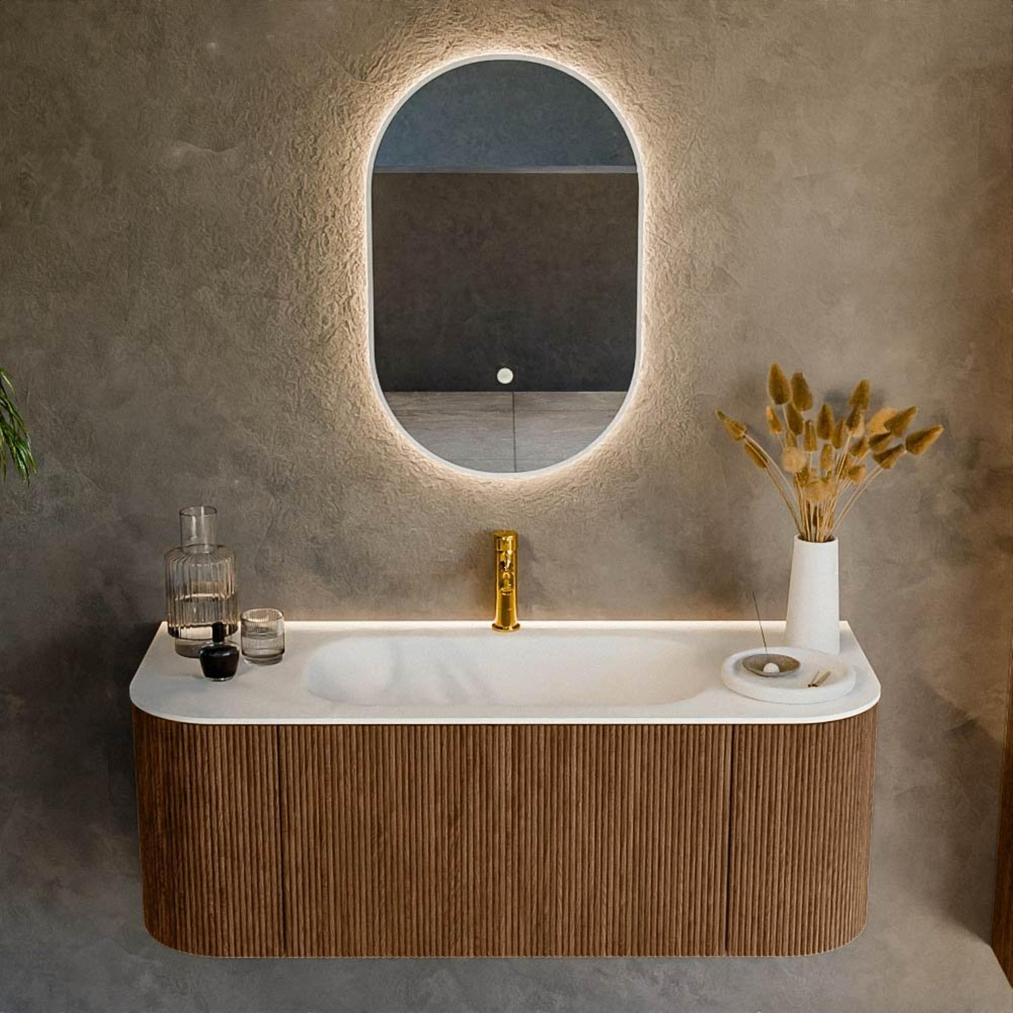 Het ultieme badmeubel dat je badkamer transformeert tot een oase van verfijning. Met zijn halfronde, verticale stroken van massief eiken, verkrijgbaar in de kleuren Oak en Walnut, straalt KURVE vakmanschap uit in elk detail. De zachte rondingen en slim ontworpen deurtjes, elk 40cm hoog, nodigen uit tot gebruik, terwijl de ruimte binnenin optimaal benut wordt dankzij de royale lade van dezelfde hoogte.