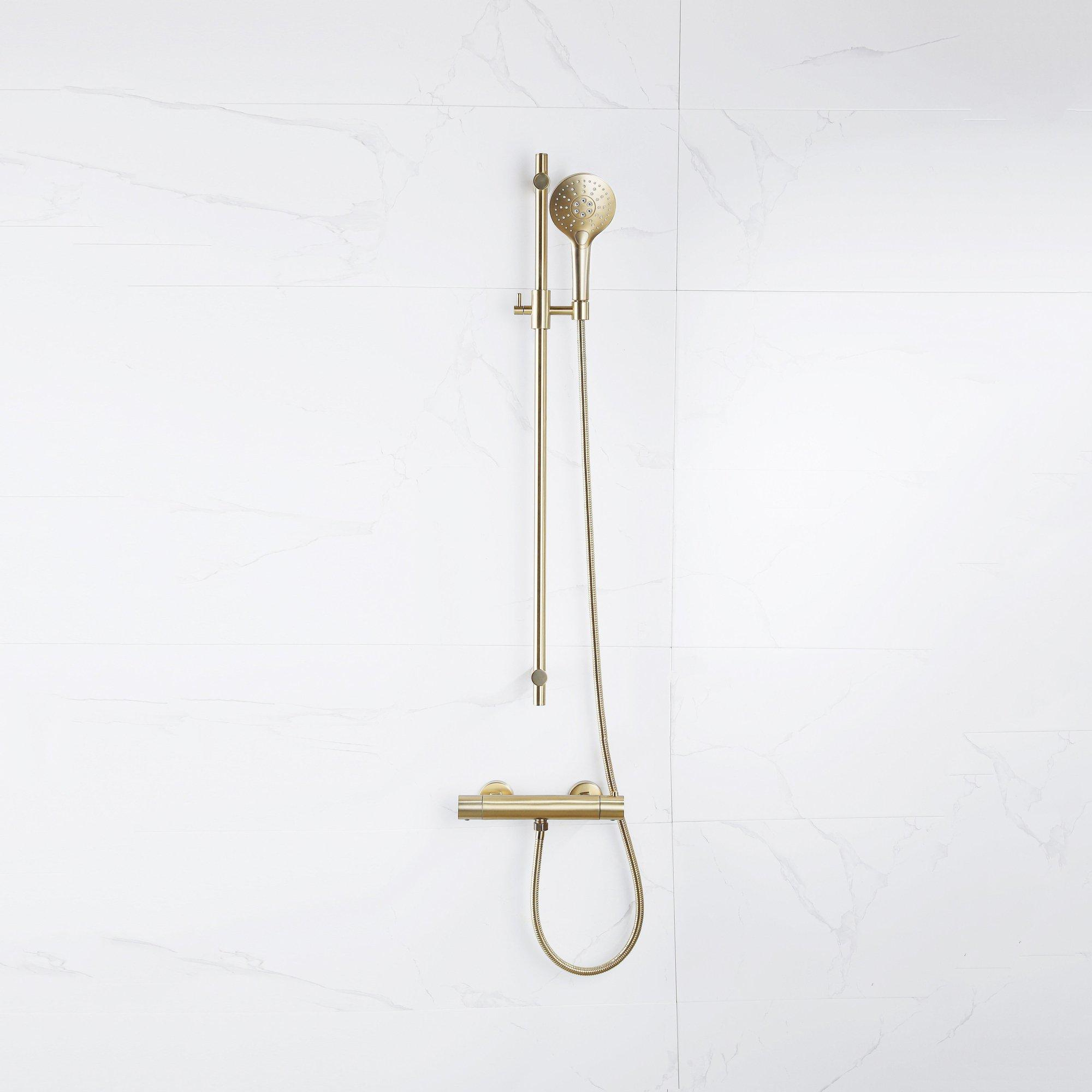 De FugaFlow Eccelente Sobrado douchekraan met glijstangset met ronde handdouche, metalen doucheslang geborsteld messing PVD is een prachtig vormgegeven en functioneel badkamerproduct dat een vleugje elegantie toevoegt aan elke badkamer. Met zijn moderne ontwerp en hoogwaardige materialen is deze douchekraan een ware eyecatcher. Geniet van een luxueuze douche-ervaring met deze kraan die zowel stijlvol als praktisch is. Met de bijgeleverde glijstangset en ronde handdouche is dit product een complete oplossing voor jouw dagelijkse behoeften.