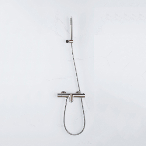De FugaFlow Eccelente Sobrado Thermostatische badkraan met staafhanddouche, handdouchehouder en metalen doucheslang in geborsteld RVS PVD is een prachtige toevoeging aan elke badkamer. Deze elegante badkraan combineert functionaliteit met stijl en zorgt voor een luxe douche-ervaring. Met zijn moderne design en hoogwaardige materialen is deze badkraan een blikvanger in elke badkamer. Geniet van een ontspannende douche met deze hoogwaardige thermostatische badkraan.