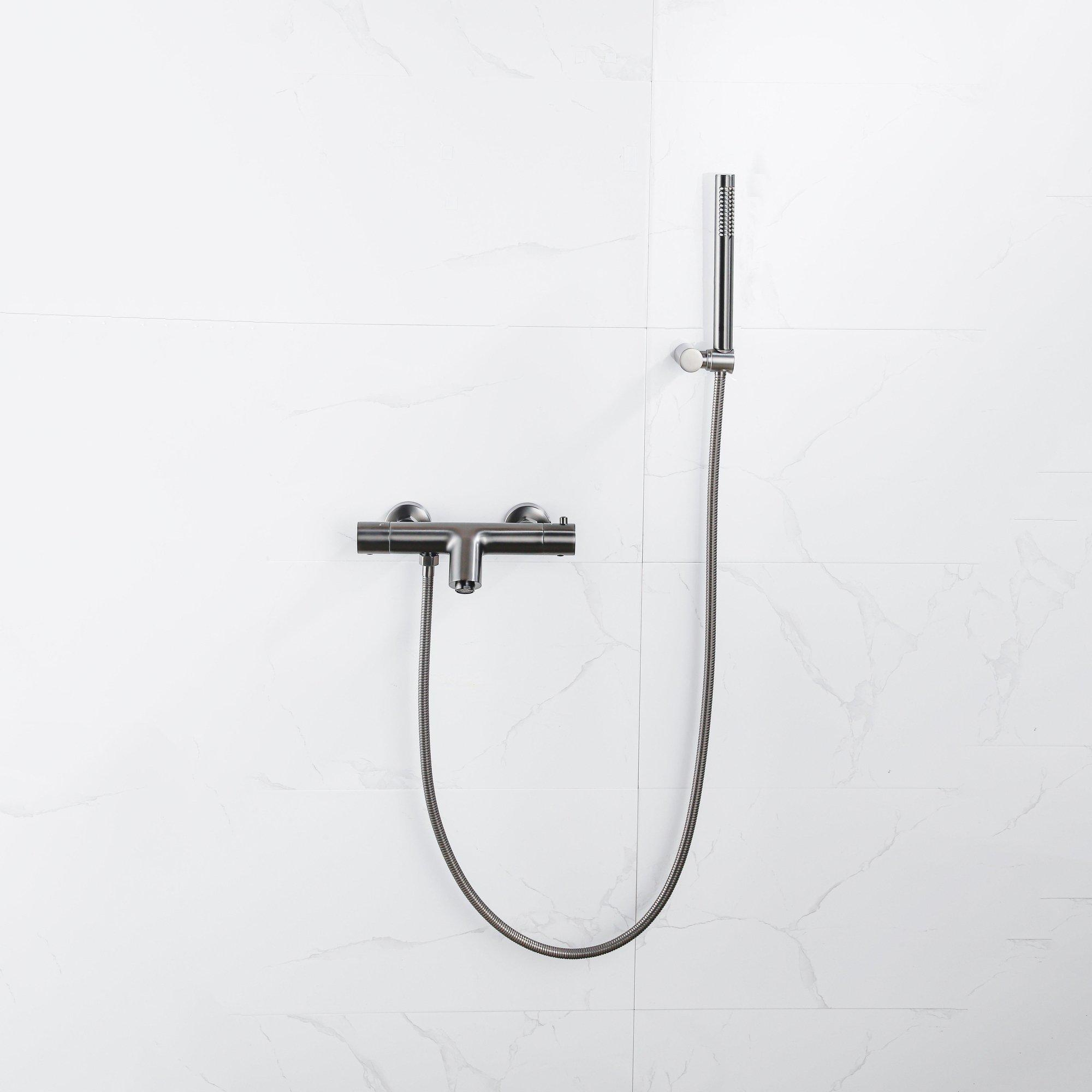 De FugaFlow Eccelente Sobrado Thermostatische badkraan met staafhanddouche, handdouchehouder en metalen doucheslang Gunmetal PVD is een prachtig vormgegeven badkraan die een vleugje luxe toevoegt aan elke badkamer. Met zijn elegante Gunmetal PVD afwerking en strakke lijnen is deze badkraan een ware eyecatcher. Niet alleen is het design van deze kraan indrukwekkend, maar ook de functionaliteit ervan is van topkwaliteit. Met de thermostatische functie kun je eenvoudig de gewenste watertemperatuur instellen en genieten van een comfortabele douche-ervaring. De bijgeleverde staafhanddouche en handdouchehouder maken deze set compleet, waardoor je kunt kiezen tussen verschillende douchestanden voor ultiem comfort.