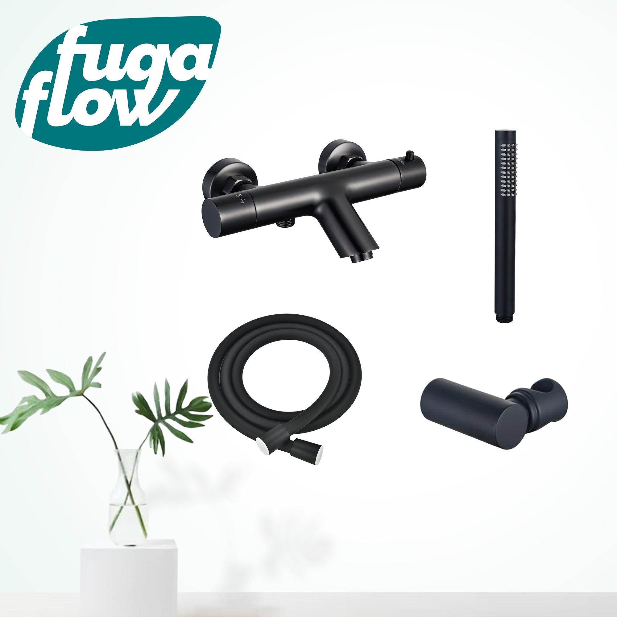 FugaFlow Eccelente Sobrado Thermostatische badkraan met staafhanddouche, handdouchehouder en gladde doucheslang mat zwart