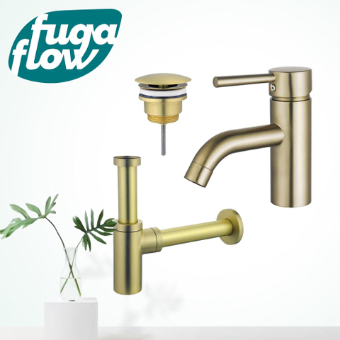 FugaFlow Eccelente Sobrado Wastafelkraanset - lage wastafelkraan - always open plug - design sifon - PVD Geborsteld Messing