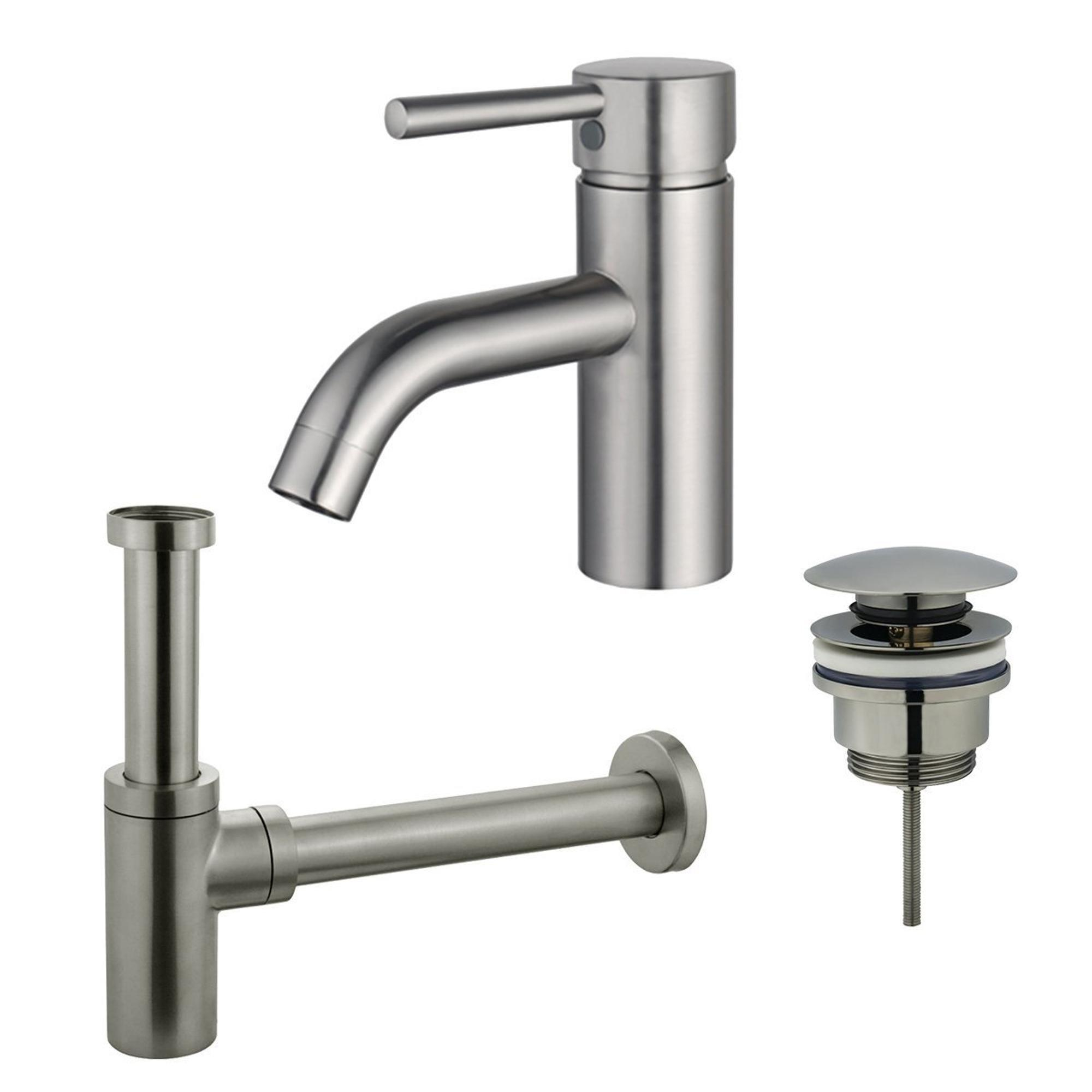 FugaFlow Eccelente Sobrado Badkamer Wastafelkraanset - lage wastafelkraan - klikwaste plug - design sifon - PVD Geborsteld RVS