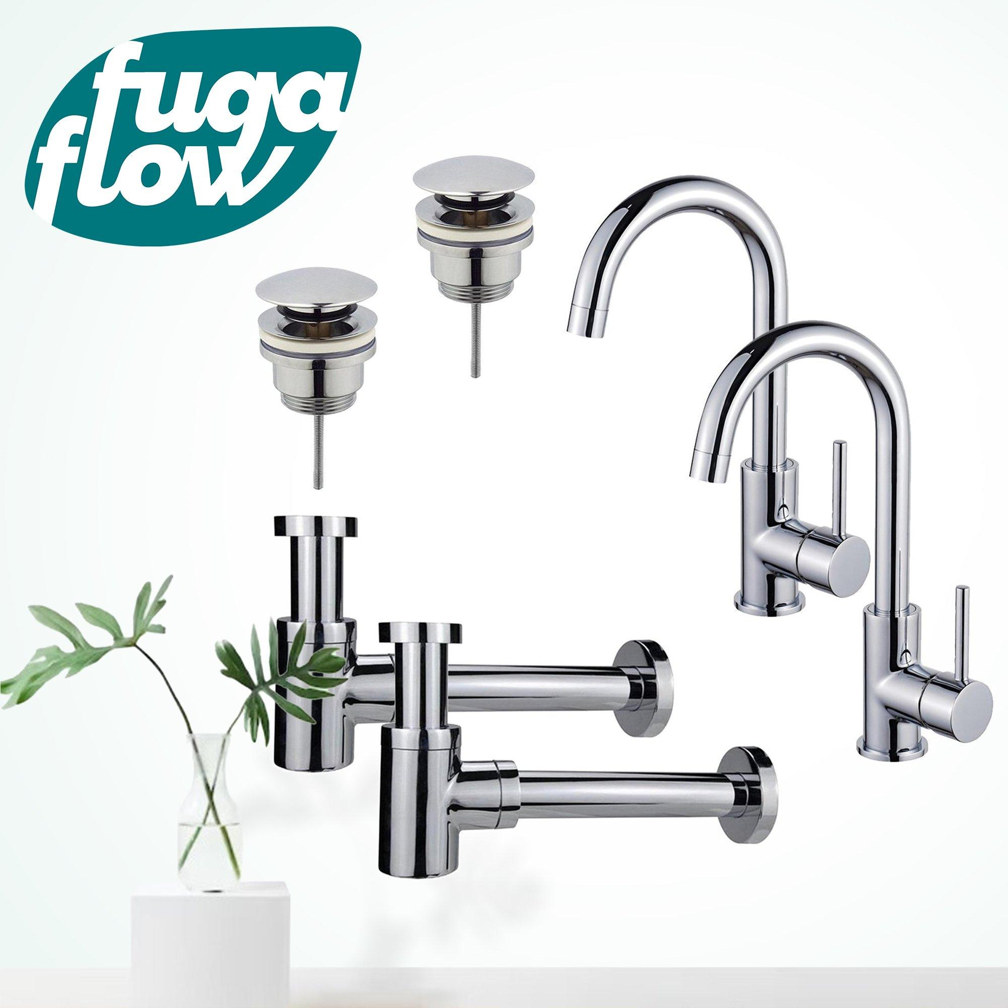 FugaFlow Eccelente Sobrado Wastafelkraanset - voor dubbele wastafel - hoge wastafelkraan - draaibare uitloop - klikwaste plug - verlaagde design sifon - Chroom