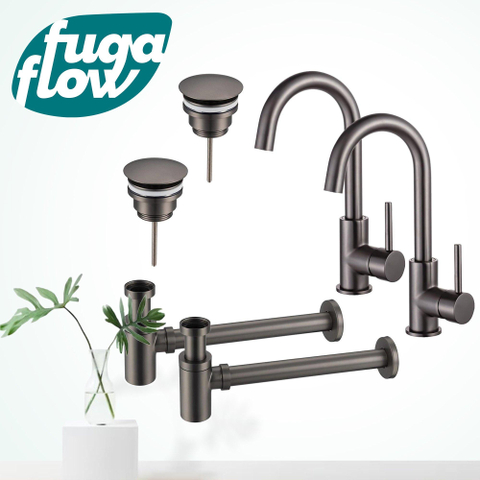 FugaFlow Eccelente Sobrado Wastafelkraanset - voor dubbele wastafel - hoge wastafelkraan - draaibare uitloop - always open plug - verlaagde design sifon - PVD Gepolijst Gunmetal