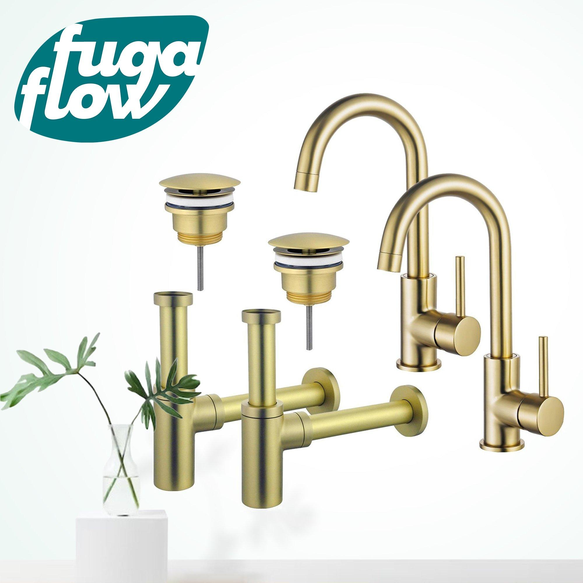 FugaFlow Eccelente Sobrado Wastafelkraanset - voor dubbele wastafel - hoge wastafelkraan - draaibare uitloop - always open plug - design sifon - PVD Geborsteld Messing