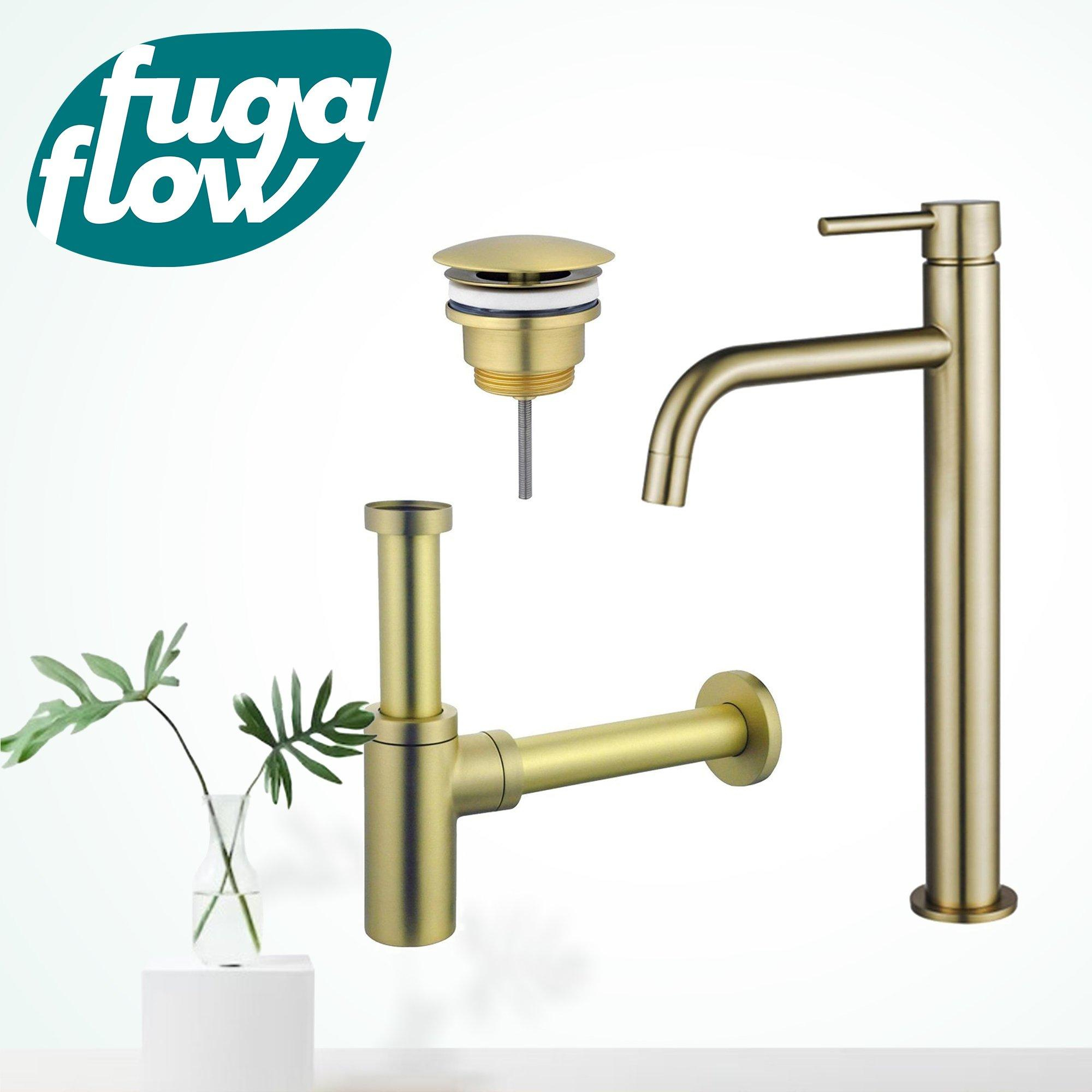 FugaFlow Eccelente Sobrado Badkamer Slim Wastafelkraanset - verhoogde wastafelkraan - always open plug - design sifon - PVD Geborsteld Messing