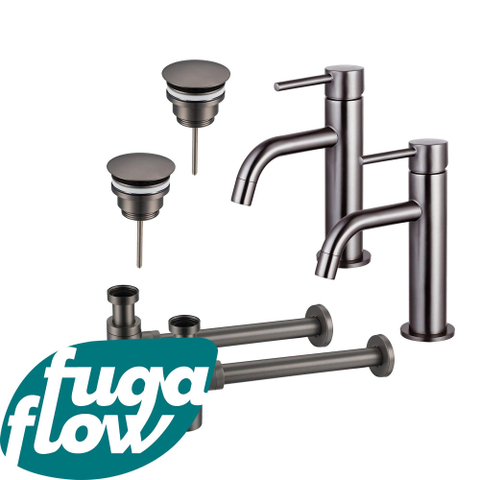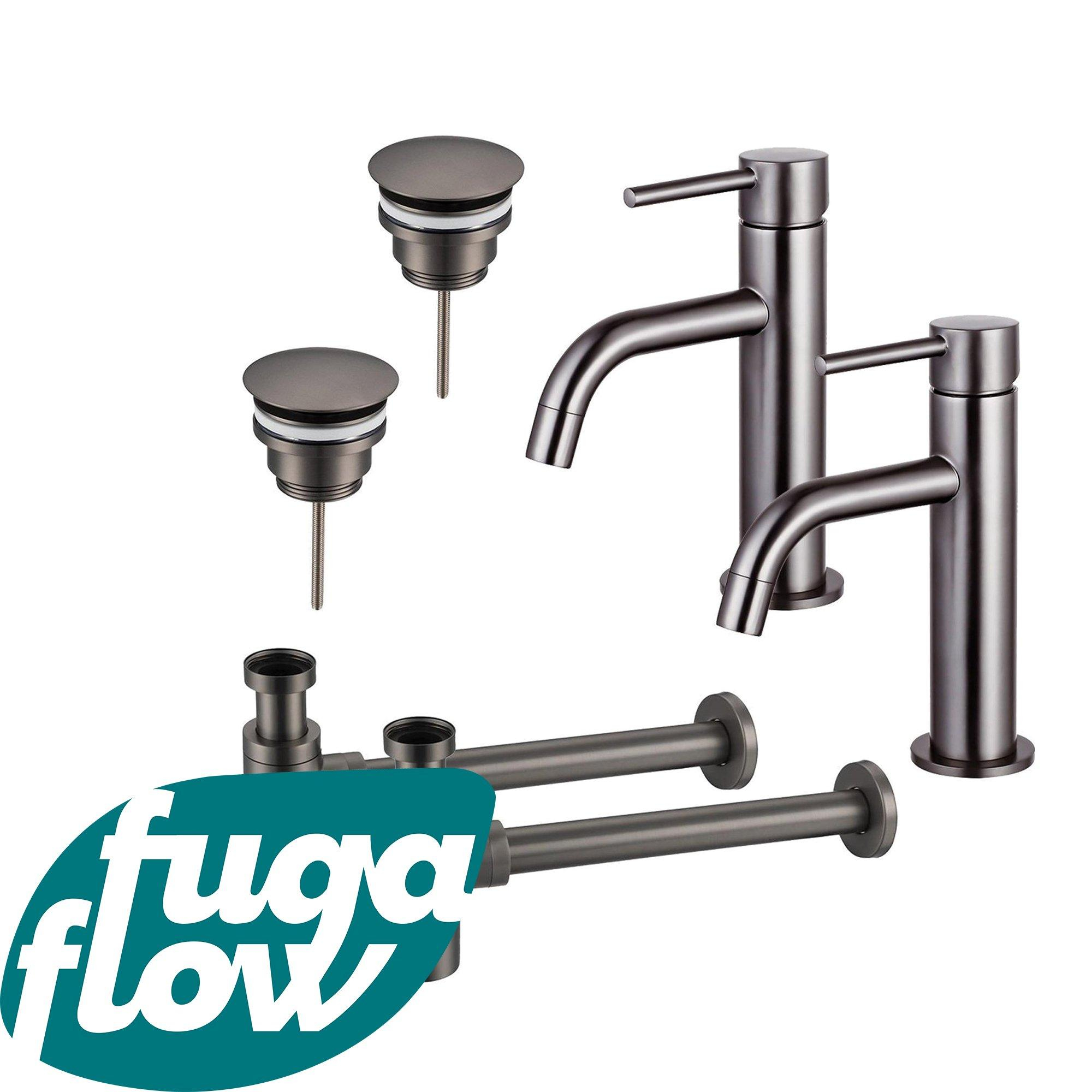 FugaFlow Eccelente Sobrado Slim Wastafelkraanset - voor dubbele wastafel - lage wastafelkraan - always open plug - design sifon - PVD Gepolijst Gunmetal