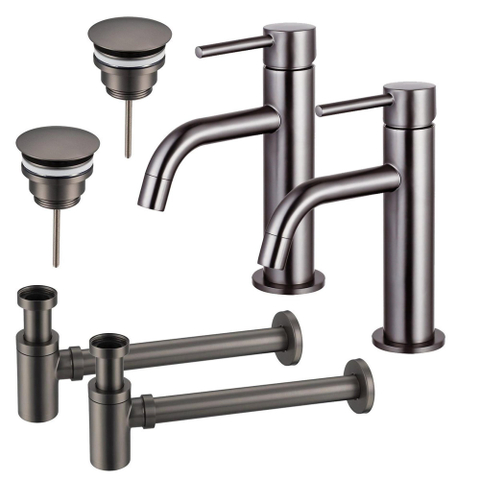 FugaFlow Eccelente Sobrado Slim Wastafelkraanset - voor dubbele wastafel - lage wastafelkraan - always open plug - verlaagde design sifon - PVD Gepolijst Gunmetal
