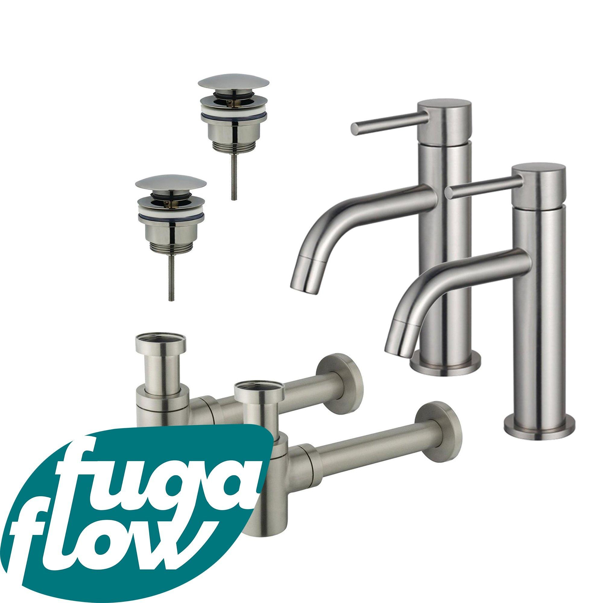 FugaFlow Eccelente Sobrado Slim Wastafelkraanset - voor dubbele wastafel - lage wastafelkraan - klikwaste plug - verlaagde design sifon - PVD Geborsteld RVS