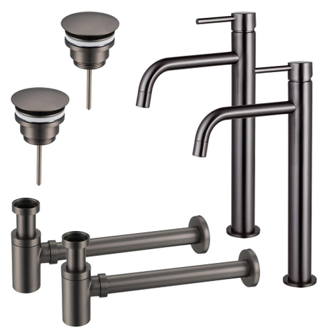 Met zijn slanke ontwerp en PVD Gepolijst Gunmetal afwerking is deze wastafelkraanset een stijlvolle keuze voor elke badkamer. Het minimalistische design past goed bij diverse interieurstijlen en voegt een vleugje luxe toe aan de ruimte. De sobere uitstraling van de kraan en accessoires zorgt voor een tijdloze look die jarenlang meegaat zonder aan elegantie in te boeten.