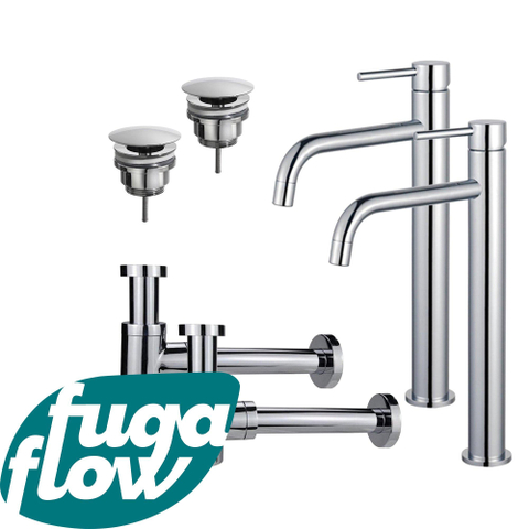 FugaFlow Eccelente Sobrado Slim Wastafelkraanset - voor dubbele wastafel - verhoogde wastafelkraan - always open plug - verlaagde design sifon - Chroom