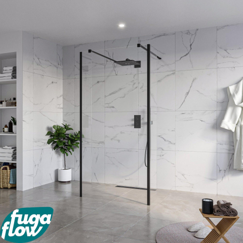 De FugaFlow Eccelente Vetro Vrijstaande Inloopdouche straalt elegantie uit in elke badkamer. Het heldere 8mm veiligheidsglas geeft een luxe uitstraling en laat de doucheruimte groter lijken. De zwarte mat afwerking voegt een vleugje moderniteit toe aan het geheel, terwijl de antikalk coating ervoor zorgt dat de douche er altijd glanzend uitziet. Met deze stijlvolle inloopdouche creëer je een ontspannende en verfijnde sfeer in je badkamer.