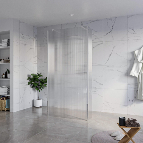 De helder geribbelde structuur van het glas geeft de inloopdouche een elegante uitstraling. Het licht speelt prachtig met de ribbels, waardoor een unieke en luxe sfeer ontstaat in de badkamer. De chroomaccenten voegen een vleugje glamour toe aan het geheel, waardoor deze douche een echte eyecatcher is in elke moderne badkamer.