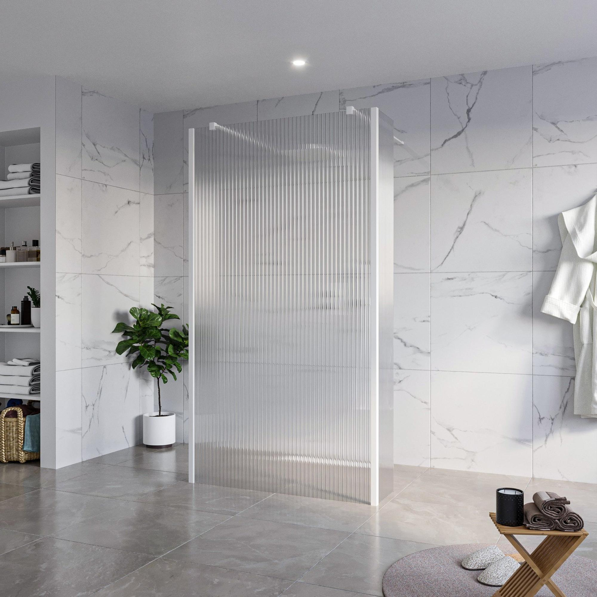 De FugaFlow Eccelente Vetro Vrijstaande Inloopdouche is een prachtig stukje vakmanschap dat je badkamer transformeert tot een oase van rust en luxe. Met zijn helder geribbeld design en antikalk eigenschappen straalt deze douche elegantie en functionaliteit uit. Het 8mm veiligheidsglas zorgt voor duurzaamheid en veiligheid, terwijl de 2 zijwanden van 30cm, samen met de wandarmen en hoekprofielen, zorgen voor een stevige constructie. De witte matte afwerking voegt een vleugje moderniteit toe aan je badkamer, terwijl de ruime afmetingen van 110x200cm zorgen voor een comfortabele douche-ervaring.