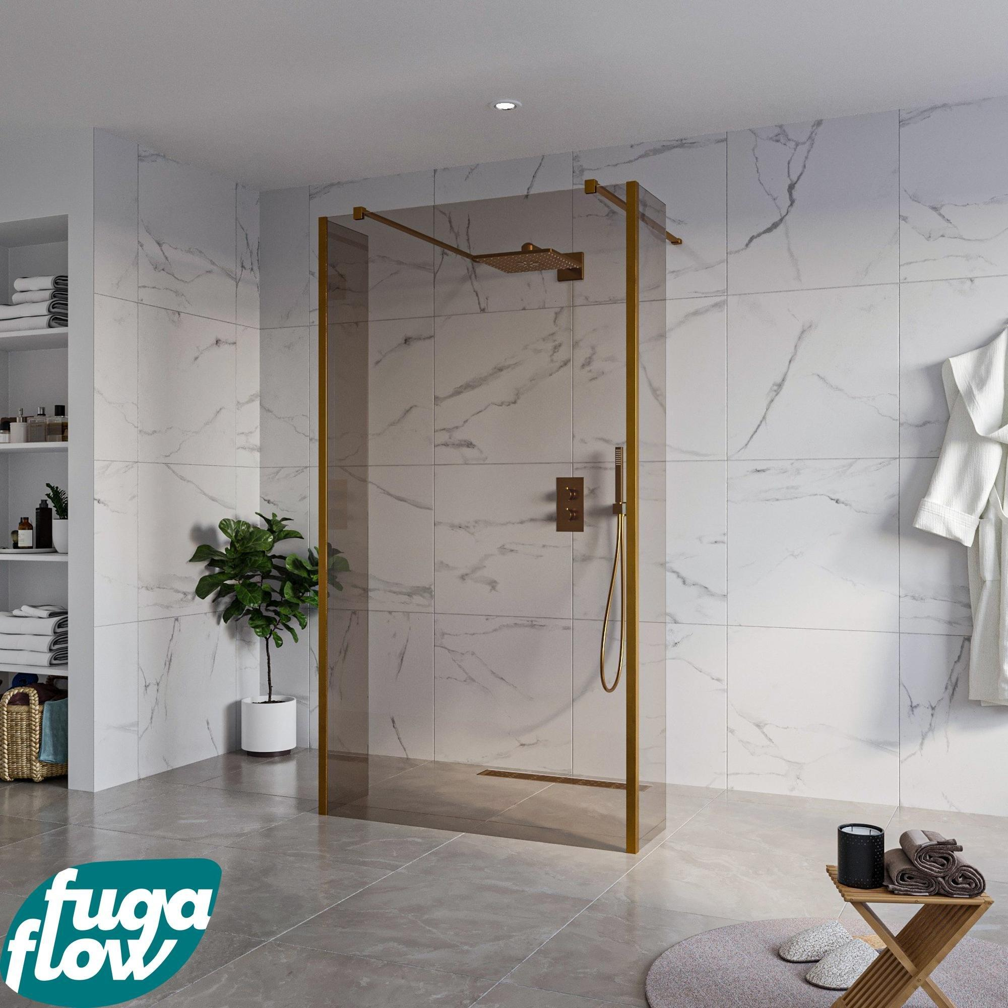 De FugaFlow Eccelente Vetro Vrijstaande Inloopdouche straalt stijl en elegantie uit met zijn rookglazen design en koper geborstelde accenten. Het moderne ontwerp past perfect in elke eigentijdse badkamer en voegt een vleugje luxe toe aan de ruimte. De combinatie van materialen en afwerking zorgt voor een tijdloze uitstraling die de tand des tijds zal doorstaan.