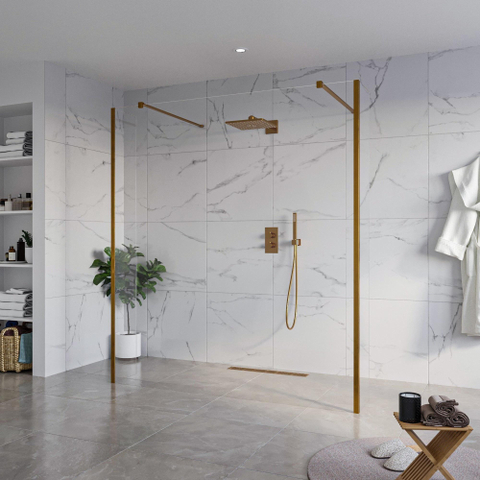 De FugaFlow Eccelente Vetro Vrijstaande Inloopdouche straalt een majestueuze allure uit die je badkamer transformeert tot een luxe oase van ontspanning. Het heldere 8mm veiligheidsglas creëert een ruimtelijk gevoel en laat het licht prachtig doorstromen. De koperen geborstelde accenten voegen een vleugje glamour toe aan de inrichting, waardoor elke douchebeurt een koninklijke ervaring wordt.