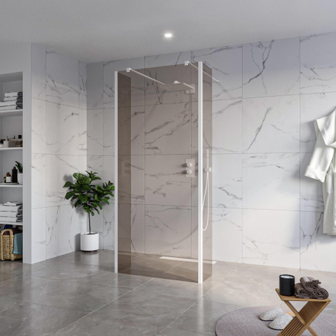 De FugaFlow Eccelente Vetro Vrijstaande Inloopdouche straalt een moderne en eigentijdse uitstraling uit. Het rookglas en de strakke lijnen passen perfect in een eigentijdse badkamerinrichting. Met zijn minimalistische ontwerp en witte matte afwerking voegt deze inloopdouche een vleugje moderniteit toe aan elke badkamer.