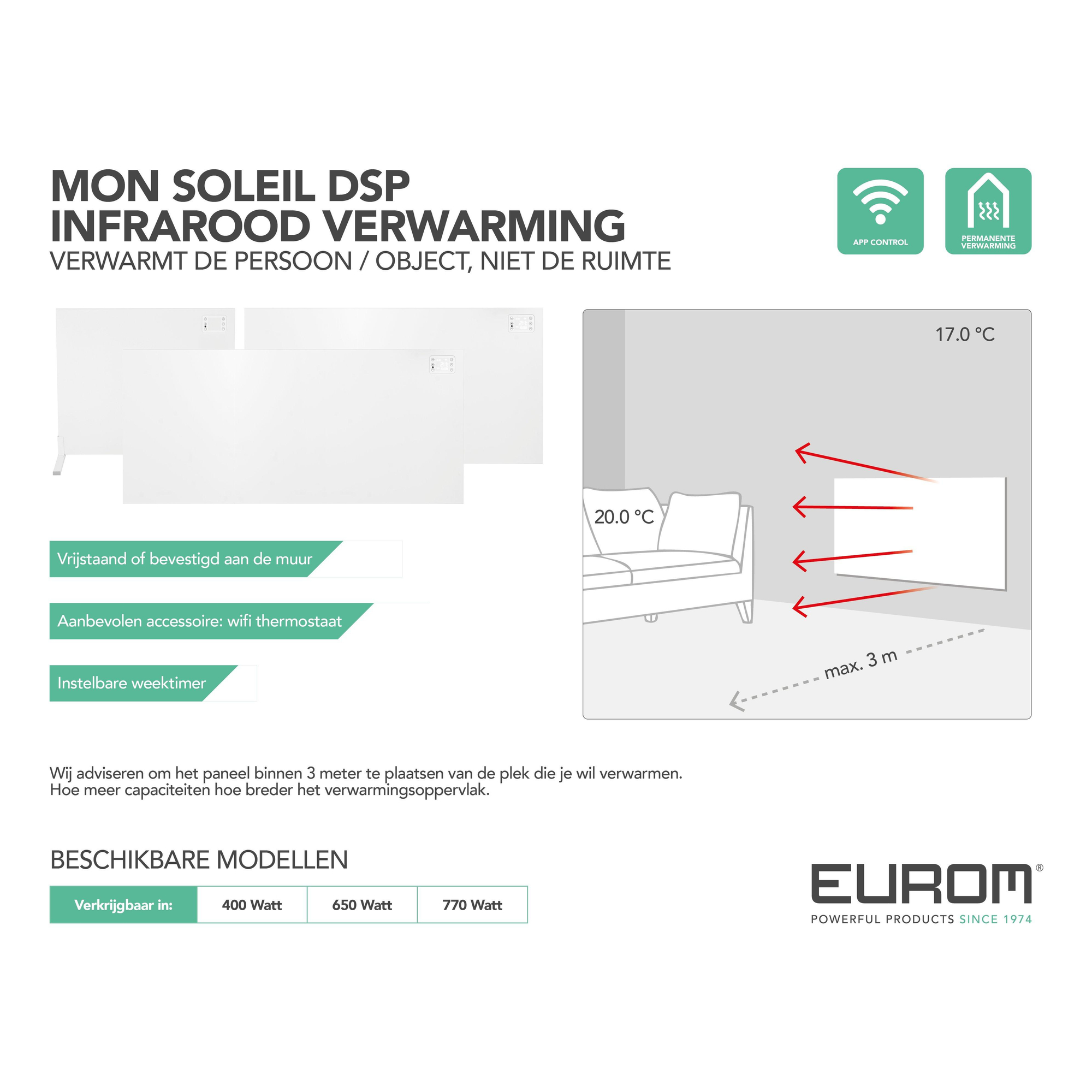 Dankzij de meegeleverde voetjes is dit verwarmingspaneel ook staand te gebruiken als een infrarood kachel.