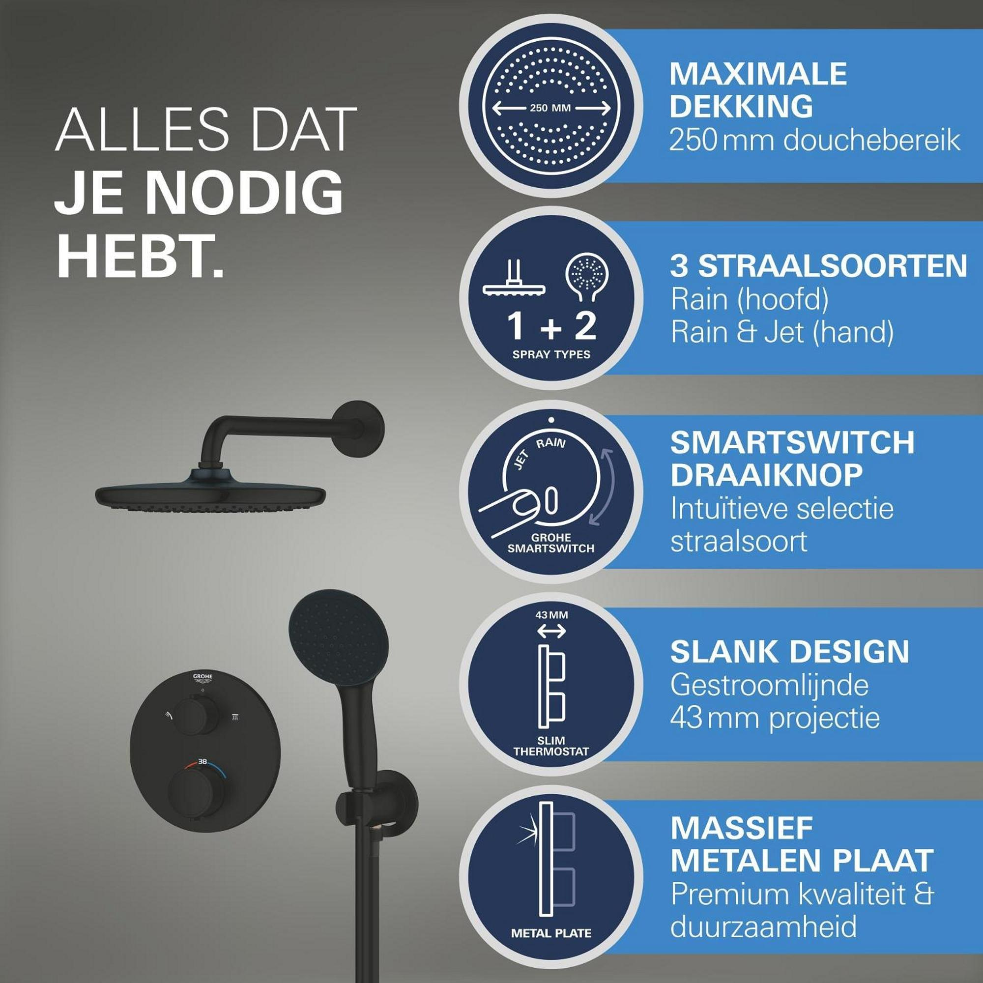Naast zijn verfijnde uiterlijk biedt de Grohe Precision showerset compleet ook uitstekende functionaliteit. Met 2 verschillende straalsoorten op de handdouche kun je kiezen voor een zachte, ontspannende stroom of een krachtige massagestraal. De inbouw douchekraan thermosstaat zorgt voor een constante watertemperatuur en de omstelfunctie maakt het eenvoudig om te schakelen tussen de handdouche en hoofddouche.