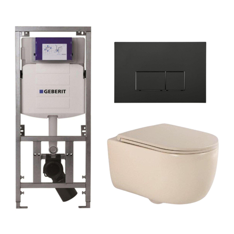 QeramiQ Dely Swirl Toiletset - 36.3x51.7cm - Geberit UP320 inbouwreservoir - slim zitting - mat zwarte metalen bedieningsplaat - rechthoekige knoppen - beige