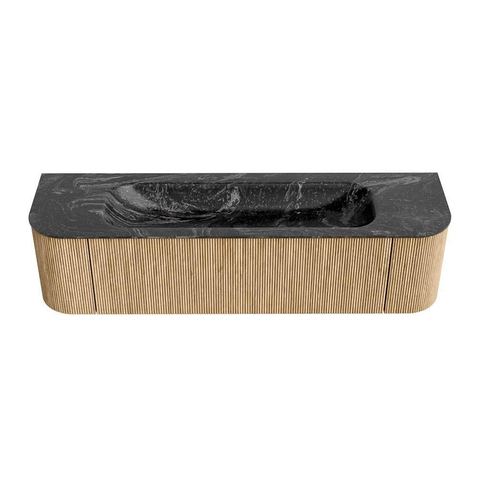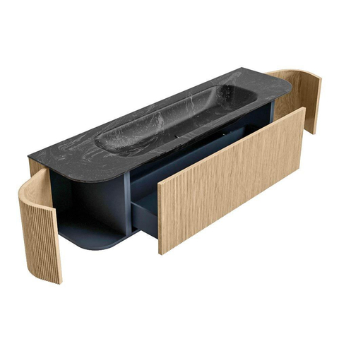 Het ultieme badmeubel dat je badkamer transformeert tot een oase van verfijning. Met zijn halfronde, verticale stroken van massief eiken, verkrijgbaar in de kleuren Oak en Walnut, straalt KURVE vakmanschap uit in elk detail. De zachte rondingen en slim ontworpen deurtjes, elk 40cm hoog, nodigen uit tot gebruik, terwijl de ruimte binnenin optimaal benut wordt dankzij de royale lade van dezelfde hoogte.