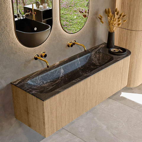 Het ultieme badmeubel dat je badkamer transformeert tot een oase van verfijning. Met zijn halfronde, verticale stroken van massief eiken, verkrijgbaar in de kleuren Oak en Walnut, straalt KURVE vakmanschap uit in elk detail. De zachte rondingen en slim ontworpen deurtjes, elk 40cm hoog, nodigen uit tot gebruik, terwijl de ruimte binnenin optimaal benut wordt dankzij de royale lade van dezelfde hoogte.