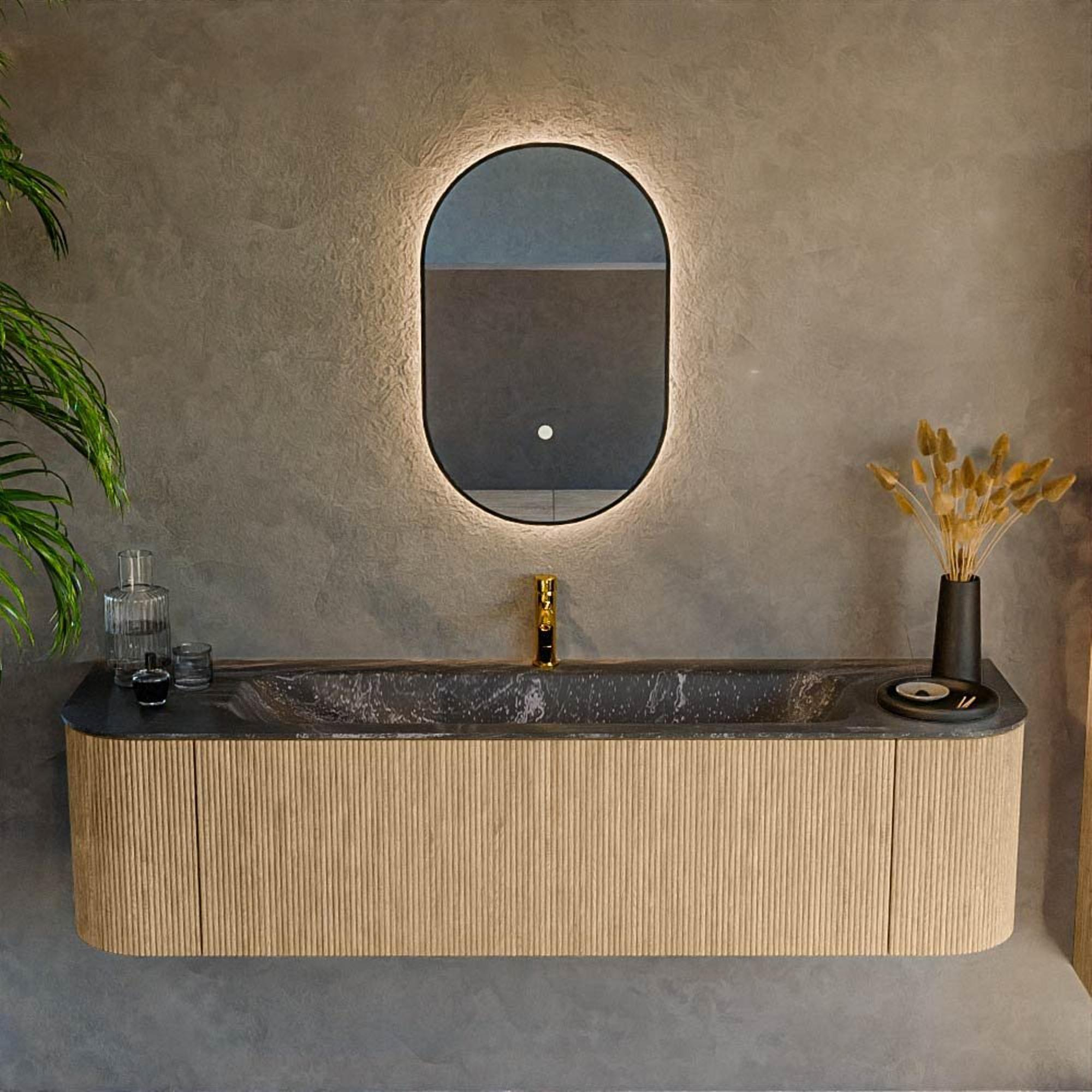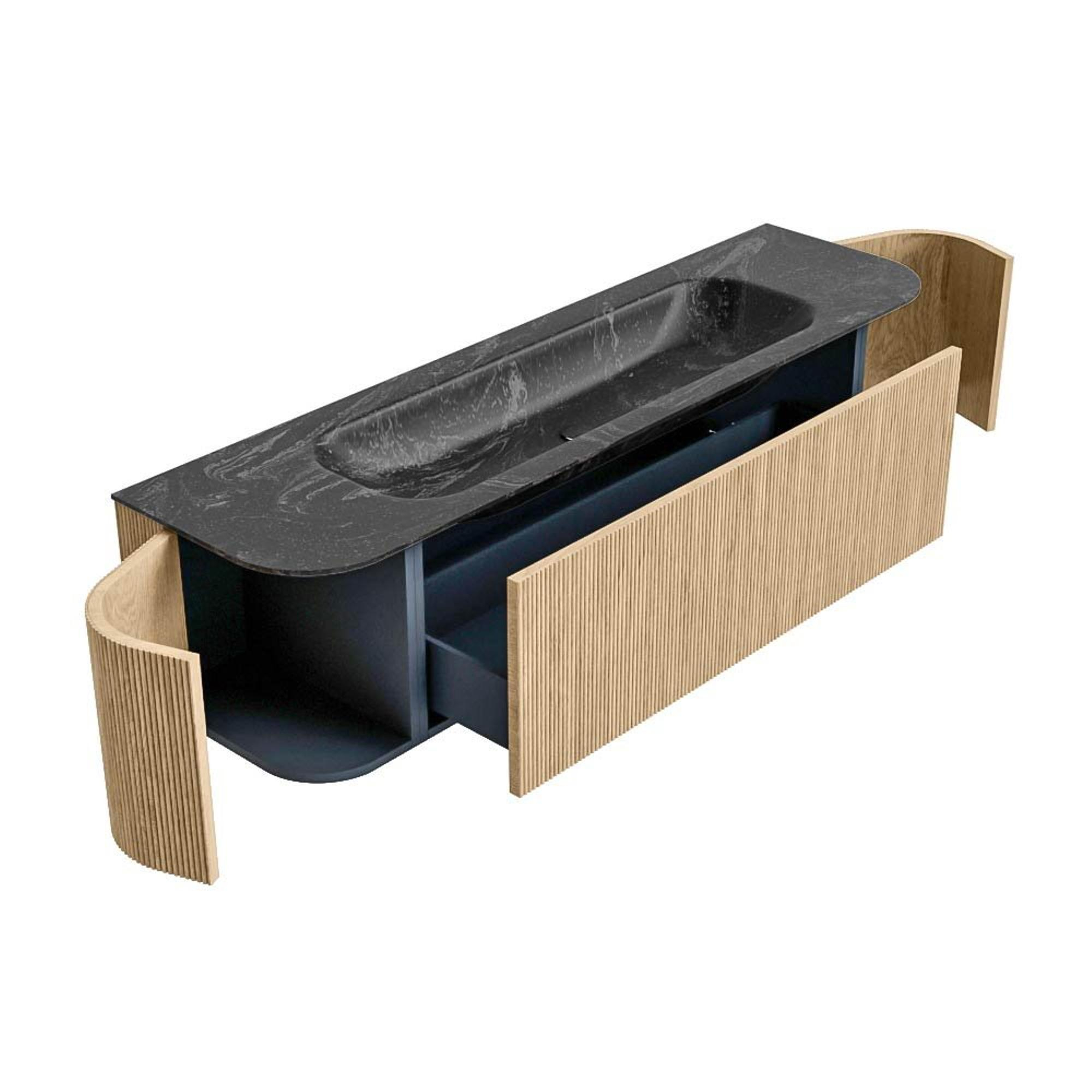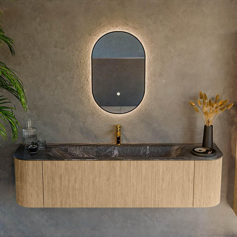 Het ultieme badmeubel dat je badkamer transformeert tot een oase van verfijning. Met zijn halfronde, verticale stroken van massief eiken, verkrijgbaar in de kleuren Oak en Walnut, straalt KURVE vakmanschap uit in elk detail. De zachte rondingen en slim ontworpen deurtjes, elk 40cm hoog, nodigen uit tot gebruik, terwijl de ruimte binnenin optimaal benut wordt dankzij de royale lade van dezelfde hoogte.