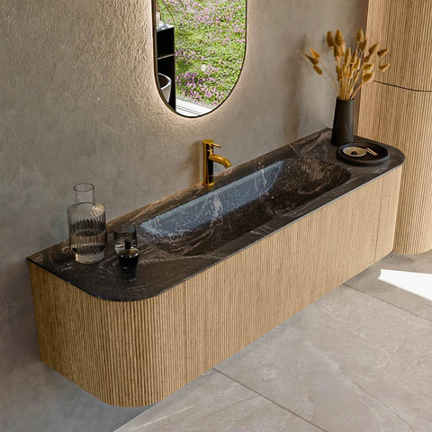 Het ultieme badmeubel dat je badkamer transformeert tot een oase van verfijning. Met zijn halfronde, verticale stroken van massief eiken, verkrijgbaar in de kleuren Oak en Walnut, straalt KURVE vakmanschap uit in elk detail. De zachte rondingen en slim ontworpen deurtjes, elk 40cm hoog, nodigen uit tot gebruik, terwijl de ruimte binnenin optimaal benut wordt dankzij de royale lade van dezelfde hoogte.