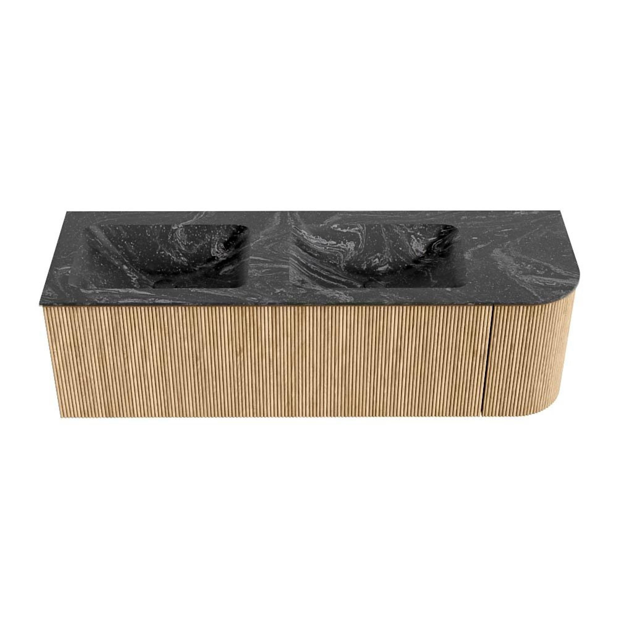 MONDIAZ KURVE-DLUX 145cm badmeubel met module 25 R kleur Oak met 1 lade en 1 deur. Wastafel LEAF dubbel / links 2 kraangaten kleur Lava.