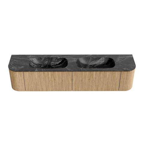 MONDIAZ KURVE-DLUX 200cm badmeubel met module 25 Len R kleur Oak met 2 lades en 2 deuren. Wastafel STOR SMALL dubbel zonder kraangat kleur Lava.