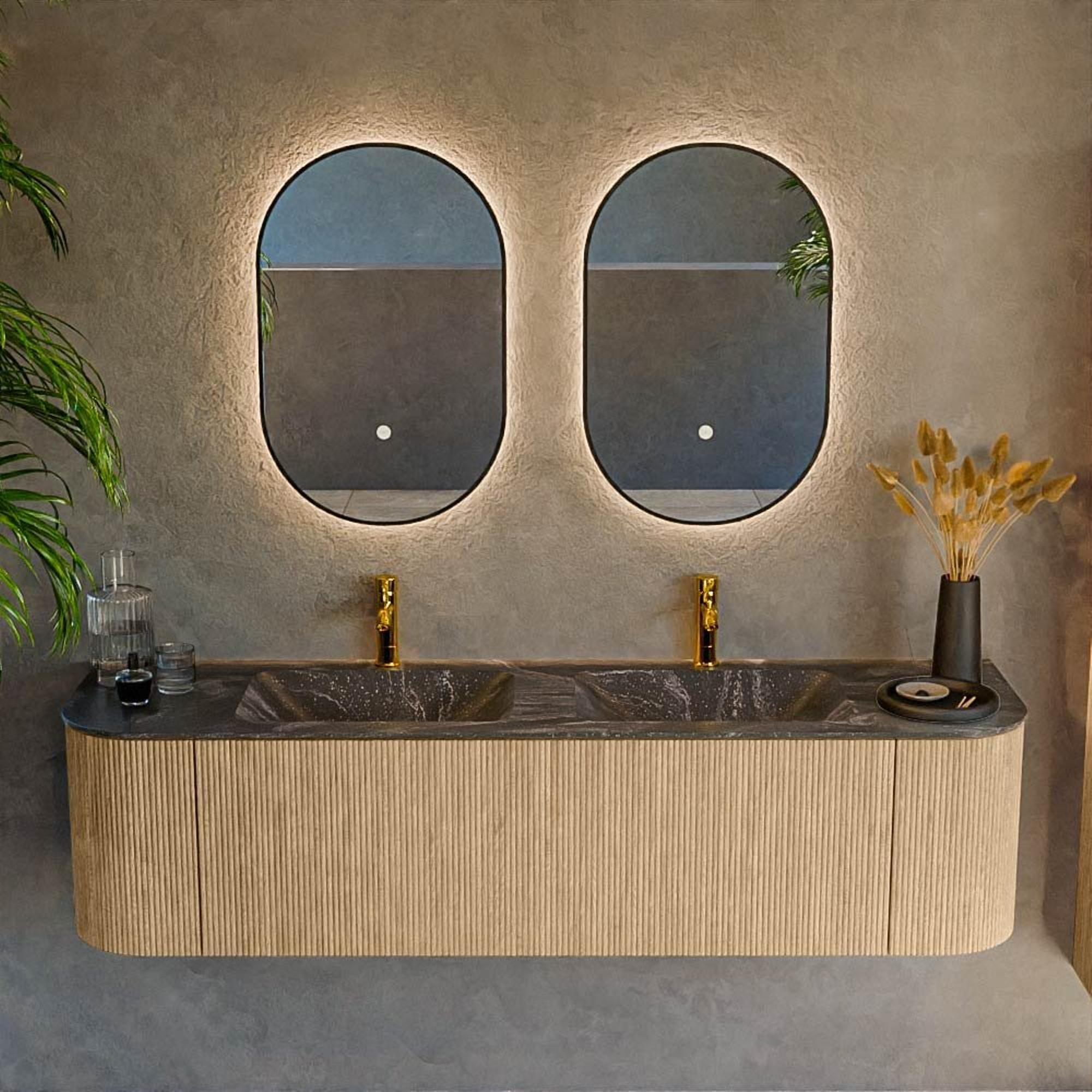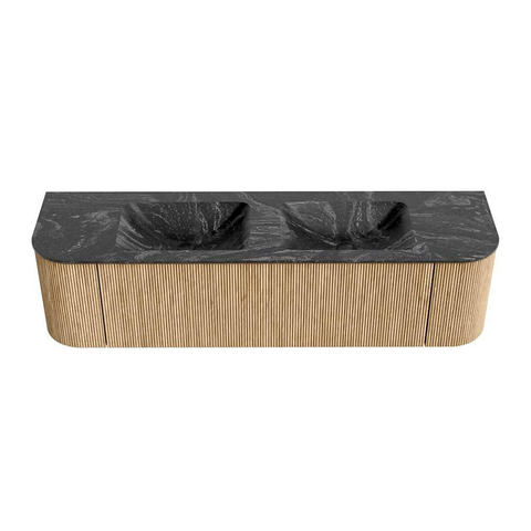Het ultieme badmeubel dat je badkamer transformeert tot een oase van verfijning. Met zijn halfronde, verticale stroken van massief eiken, verkrijgbaar in de kleuren Oak en Walnut, straalt KURVE vakmanschap uit in elk detail. De zachte rondingen en slim ontworpen deurtjes, elk 40cm hoog, nodigen uit tot gebruik, terwijl de ruimte binnenin optimaal benut wordt dankzij de royale lade van dezelfde hoogte.