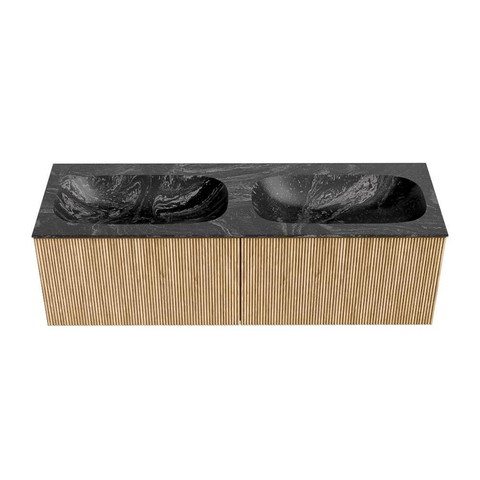 MONDIAZ KURVE-DLUX 140cm badmeubel kleur Oak met 2 lades. Wastafel STOR SMALL dubbel zonder kraangat kleur Lava.