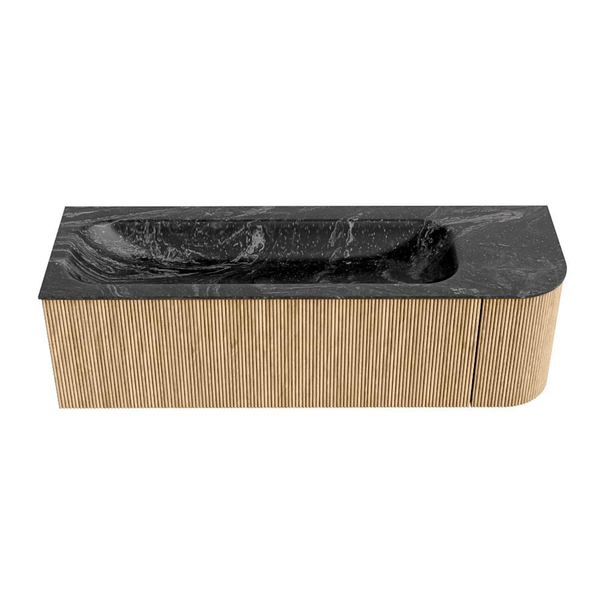 MONDIAZ KURVE-DLUX 145cm badmeubel met module 25 R kleur Oak met 1 lade en 1 deur. Wastafel BIG LARGE links 2 kraangaten kleur Lava.