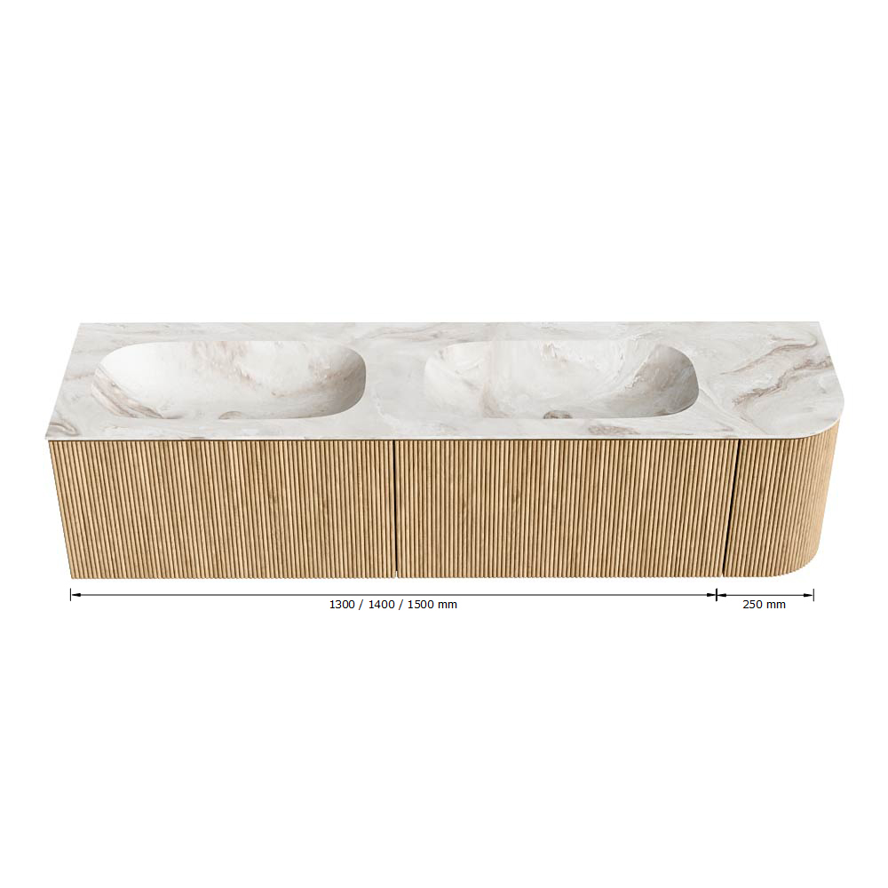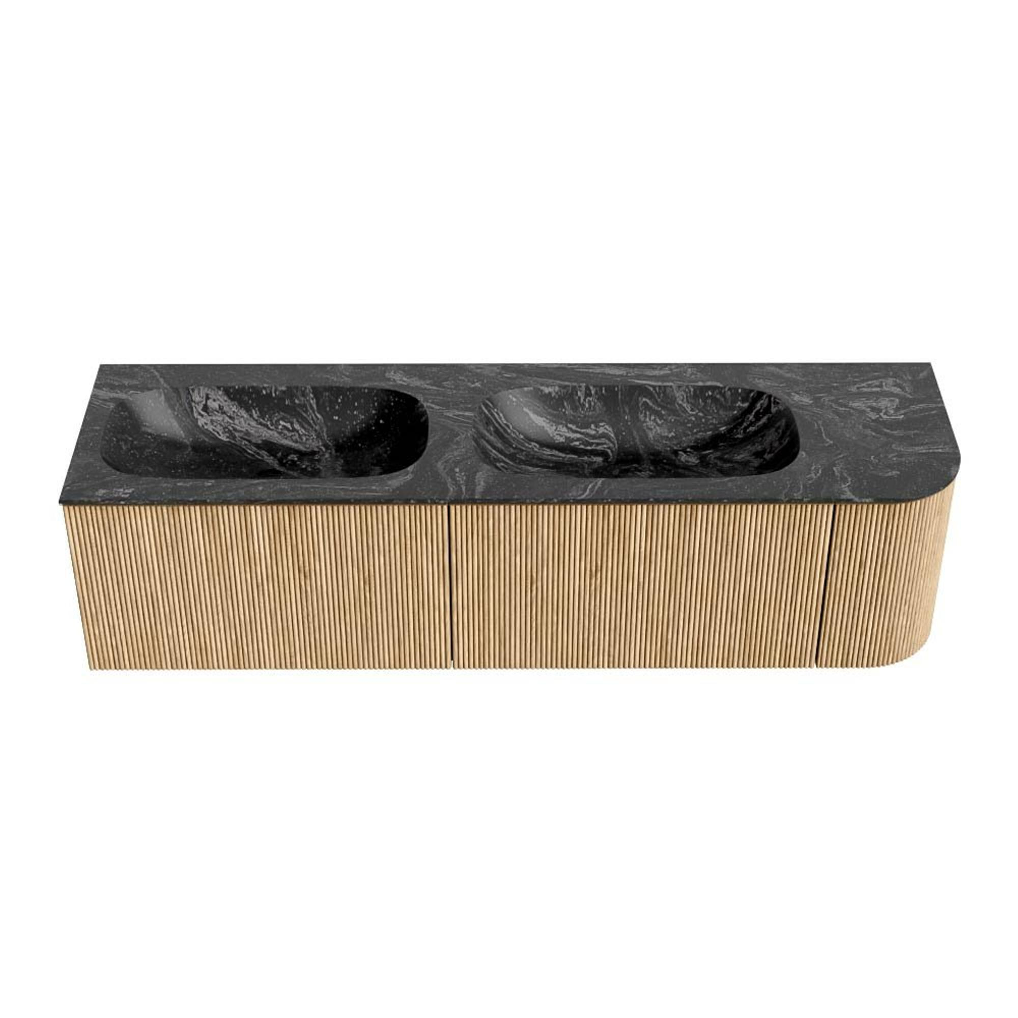 MONDIAZ KURVE-DLUX 165cm badmeubel met module 25 R kleur Oak met 2 lades en 1 deur. Wastafel STOR SMALL dubbel / links 2 kraangaten kleur Lava.